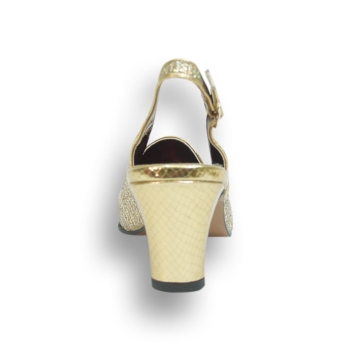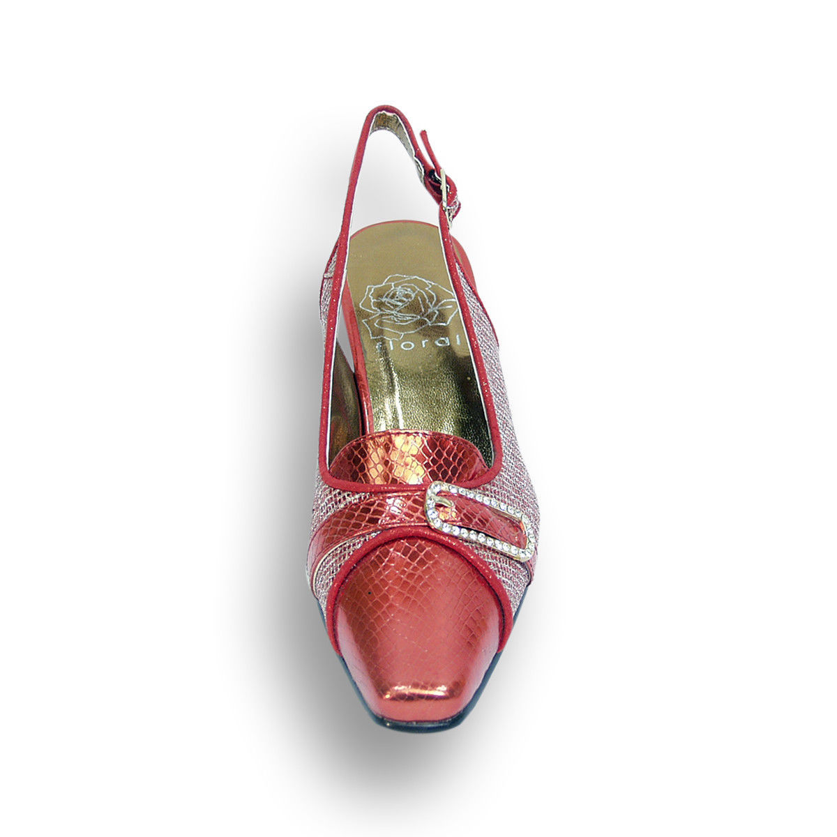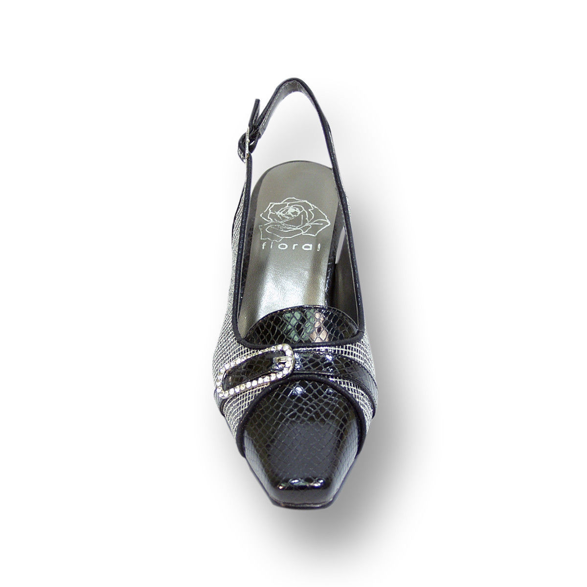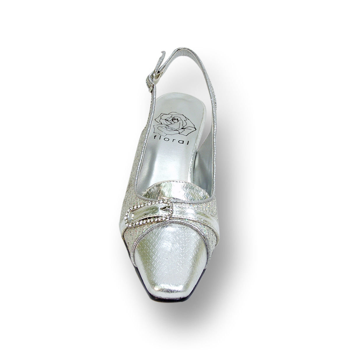 The sophisticated Floral Elena women extra wide width square toe slingback is a classy and timeless dress pump. This elegant 2" mid-heel ladies closed toe slingback has a reptilian scaly skin PU print toe cap with a decorative rhinestone jewel buckle on the upper to create a special.