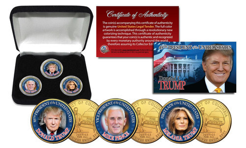 This is the DONALD TRUMP MIKE PENCE 2016 collectible two (2) coin set. These high-quality, genuine Legal Tender United States coins have been colorized using a unique painstaking multi-color authentic process by the Merrick Mint. Colorizing coins involves the unique application of special inks directly to the surface of a coin that achieves a level of detail, color saturation, and durability that is #1 in the coin industry. The result is an everlasting colorized coin collectible of ultra-high quality. Each coin comes in a premium coin capsule with a display stand. The 2-coin set comes with a Certificate of Authenticity to guarantee that your coins are authentic and recognized by every monetary authority around the world, assuring its Collector Edition status.