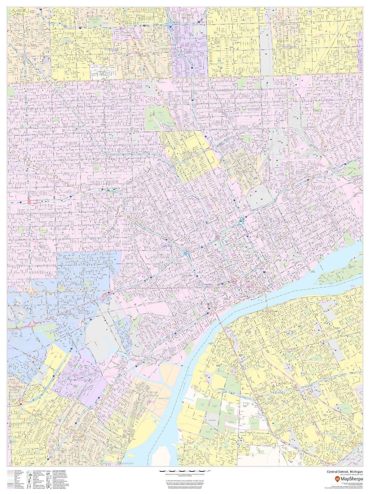 Central Detroit, Michigan Laminated Wall Map (Portrait) (MSH)