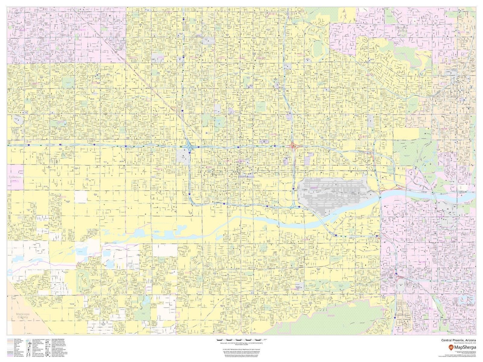 This landscape-oriented map of central Phoenix, Arizona shows detailed street level information including extensive street labeling. Ideal for planning of deliveries, home services, sales territories, real estate and much more. Base map features include all roads with major roads and highways labelled; neighborhood names; railways; high level land use such as parks and recreation areas, industrial areas and hospital campuses; and a variety of points of interest including schools, libraries, stadiums, museums, border crossings and more.