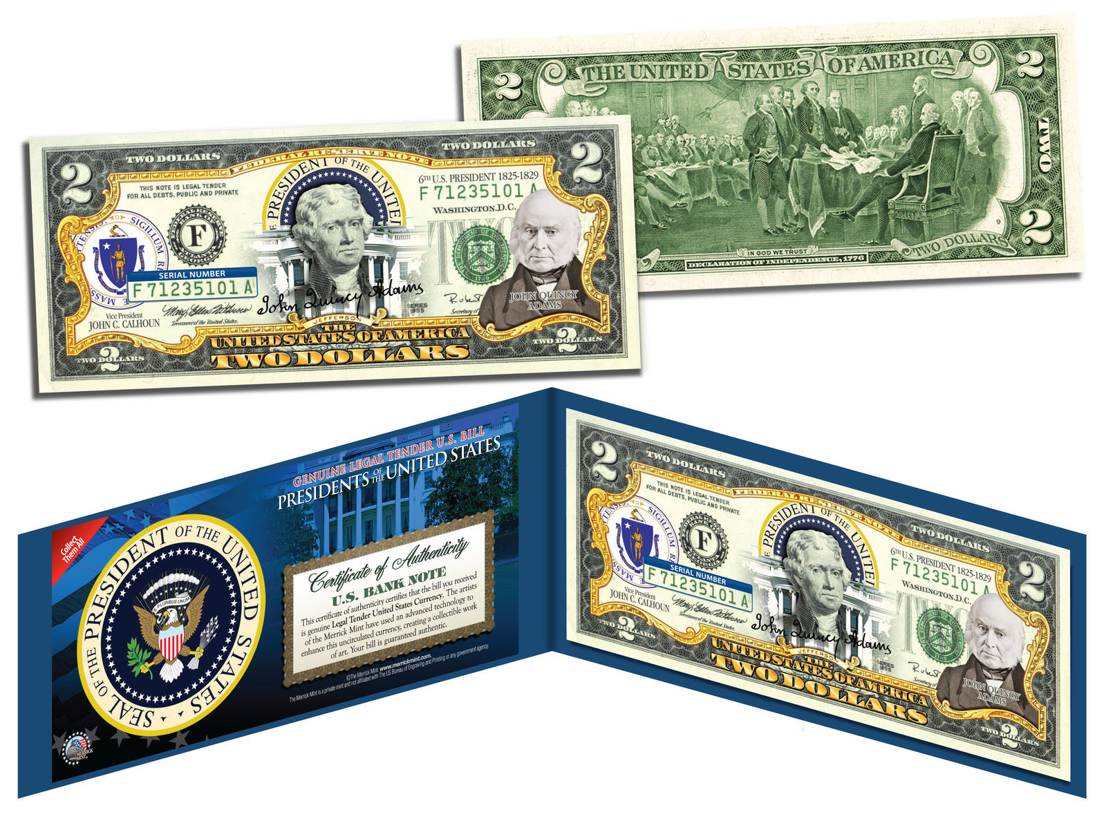The PRESIDENT JOHN QUINCY ADAMS uncirculated $2 Bill is Genuine Authentic Legal Tender of the United States, which has been enhanced with a beautiful colorized image of the President and the Seal of the State of his birthplace on the obverse of the bill. The full colorized images are accomplished through a revolutionary new authentic genuine colorization process pioneered by The Merrick Mint. Included is a Certificate of Authenticity to guarantee that your bills are authentic and recognized by every monetary authority around the world, and assuring its Collector Edition status. Each $2 Bill is in FRESH, CRISP, UNCIRCULATED condition, and was directly removed from untouched wrapped Federal Reserve sealed packs. Former U.S. President Thomas Jefferson is featured on the obverse of the note, along with the special colorization overlay. The Signing of the Declaration of Independence by John Trumbull is featured on the reverse. It is the only U.S. Currency note that features two Presidents, John Adams and Thomas Jefferson, and it is one of the most rarely seen BILLS in circulation and actual use.