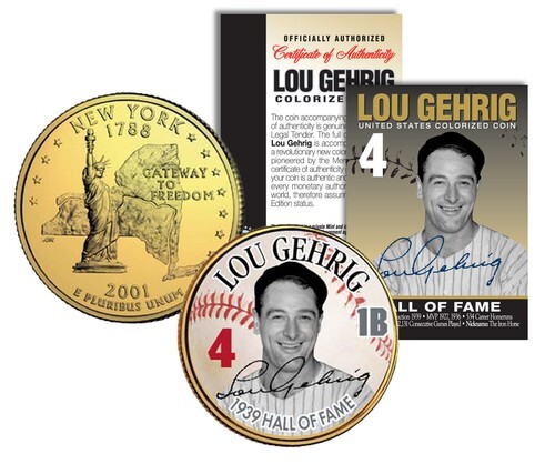 This BASEBALL LEGENDS ? LOU GEHRIG ?The Iron Horse 4 1B? coin is a treasured collectible, successfully combining baseball with coin collecting. Here is your opportunity to own or to gift, a beautifully colorized JFK Kennedy Half Dollar U.S. Coin, which has been layered in Genuine 24 Karat Gold, and then enhanced with a beautiful colorized image by the Merrick Mint. Each coin comes in a premium coin capsule with a full color Certificate of Authenticity. This Legal Tender United States coin has been colorized with an application of special inks directly to the surface of the coin, using a unique and painstakingly multicolor coin process, which achieves a level of detail, color saturation, and durability that is #1 in the coin industry. The result is an everlasting colorized coin collectible of ultra-high quality. The Kennedy half dollar is a U.S. fifty cent coin with coin year and mint marks chosen at random.