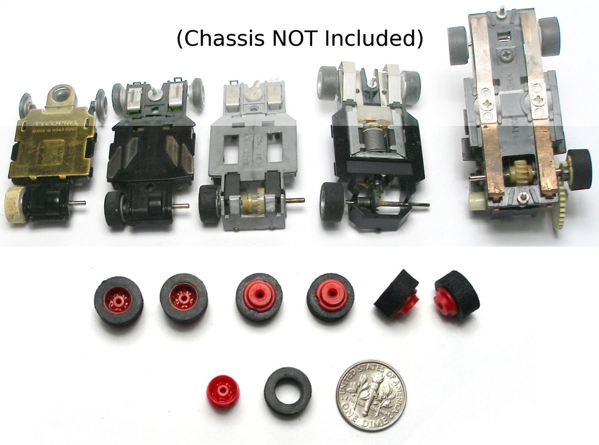 This listing is for SIX (6) Tires (6) SIX Wheels; 12 Pieces All Together. They are Unused HO Scale Vintage TYCO Industries Slot Car Parts. Factory direct ready to use. They fit TYCOPRO, Curvehugger HP2, HP3, HP7 U-turn as well as many other chassis styles by other manufacturers. The Tires will also fit well on US-1 vehicles made by TYCO but may need the inner hub sanded to accommodate the width of some US-1 Accessories. Sanding allows the hub to slide further down the axle. NO CHASSIS ARE INCLUDE IN THIS LISTING; THEY ARE PICTURED FOR REFERENCE ONLY.