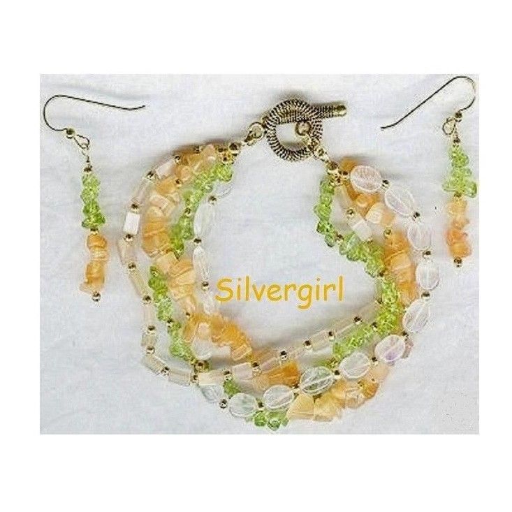 This is a new hand crafted genuine polished multi gemstone 4 strand bracelet and earring set. It has 1 strand of oval shimmering moonstone, 1 strand using cubed tube peach moonstone, 1 strand using genuine green peridot chips and the 4th pretty peach aventurine chips. I really like this combination. The bracelet is about 8" long with a gold plated toggle clasp and the earrings are 2" long with gold plated ear wires.