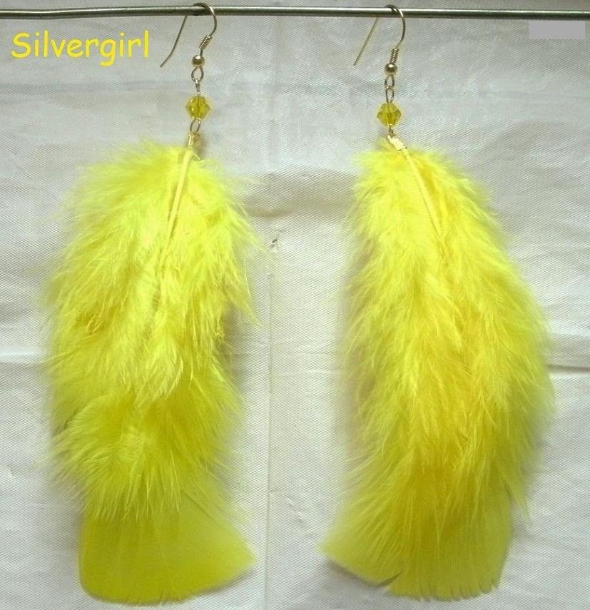 6. This is a pair of about 5 1/2" fun and funky feather earrings I made. They are made of 2 soft fun bright yellow feathers connected with a pair of Gold plated metal claps, a matching 6mm bright yellow coloured swarovski crystal and hung from Gold Plated hooks. The feathers are about 4 1/4" long.