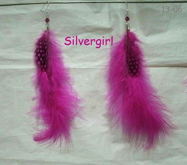 3. This is a pair of about 8" fun and funky feather earrings I made. They are made of real natural but dyed feathers in a bright bold hot pink/fuchsia. Hanging from surgical steel silver plated ear hooks with a fuchsia 6mm bicone crystal and a fluffy pink feathers with smaller black pink dotted feathers. I have added 2 strands of cobra style silver plate chain, 1 about 4" and 1 about 2 3/4" long.