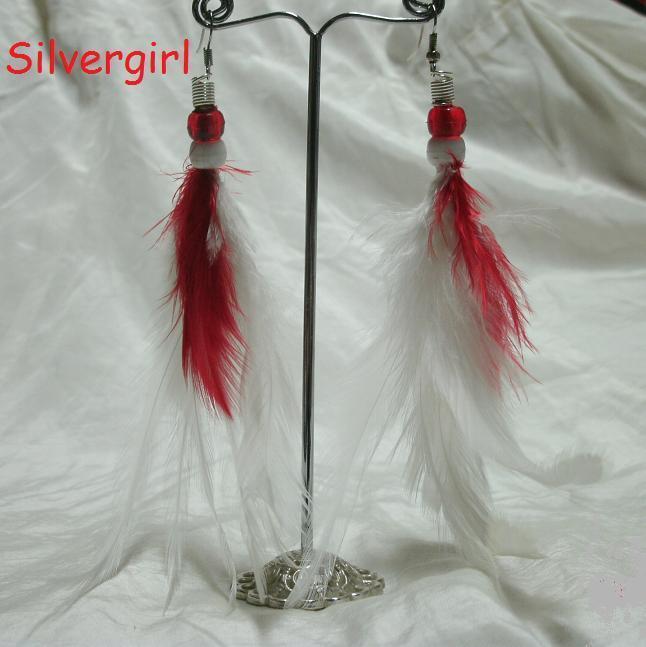 11. For these pretty earrings I have used several thin white feathers and 1 red, a white and red pony bead and silver plate findings and allergy free surgical steel ear wires. They are about 5.5" long.