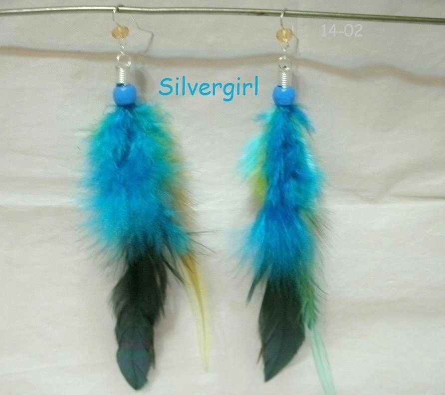 1. This is a pair of about 6.75" fun and funky feather earrings I made. They are made of 3 long thin feathers using the colours Black (with the peacock colours shimmering on) Deep rich peacock blue, a green minty one and copper coloured one and a blue pony bead clear swarovski gold crystal and silver plated findings to finish them off.