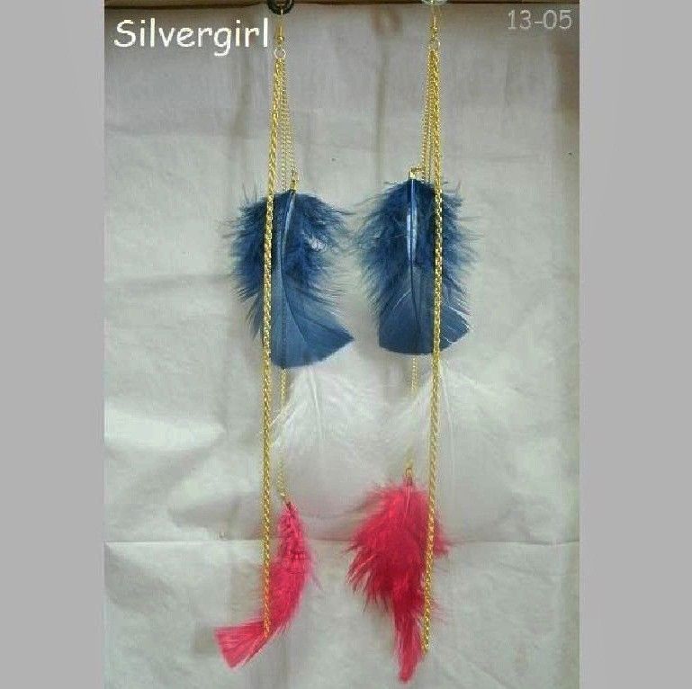 4. This is a pair of about 11" fun and funky feather earrings I made. They are made of real natural and dyed feathers in red, white and blue. Strung on gold plated chain and connected with a pair of a gold plate allergy free hooks.