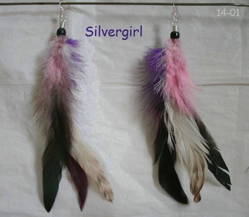 2. This is a pair of about 7.5" fun and funky feather earrings I made. They are made of several long thin feathers using the colours Black (with the peacock colours shimmering on) beige/cream mix, with some pink, purple and white fluff on top. I have used a black pony bead clear swarovski pink crystal and silver plated findings to finish them off.