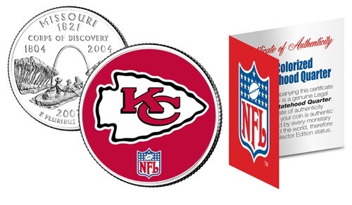 Here is your chance to own an OFFICIALLY LICENSED beautifully colorized U.S. Statehood Quarter. Each U.S. Mint State Quarter corresponds to the NFL team's home state, and is officially licensed and approved by the National Football League (NFL). This official high-quality genuine Legal Tender United States Coin has been colorized using a unique multicolor authentic process. Colorizing coins involves the unique application of special inks directly to the surface of a coin using a unique and painstakingly multicolor coin process, that achieves a level of detail, color saturation, and durability that is #1 in the industry. The result is an everlasting colorized coin collectible of ultra-high quality. Each coin comes in a premium coin capsule with a Certificate of Authenticity. This coin is OFFICIALLY LICENSED!