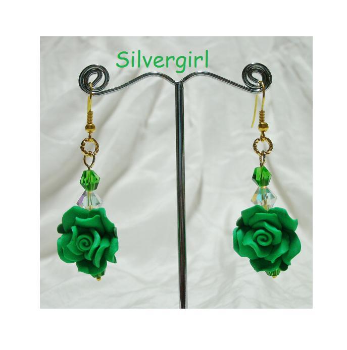 For these pretty earrings I have used some lovely 3/4" or 20mm green polymer clay rose flowers, 6 and 8mm Swarovski crystals in green and AB clear, gold plated findings and ear wires. They are 2.25" long.