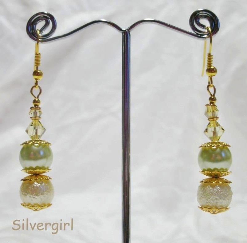 For these pretty earrings I have used some lovely 8mm Luna and smooth glass pearl beads. The Luna bead is yellow and the smooth pearl has a slight green tinge to it, gold plate ear wire, 6mm and 4mm yellow Swarovski crystals, gold plated bead caps, 2mm balls. Total length is about 2 1/8" long.