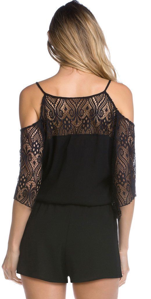 The Becca Poetic Black Romper is a black lace and crinkle material romper that is a fun and lightweight cover up featuring a cold shoulder style with a cinched waist and lace insets.