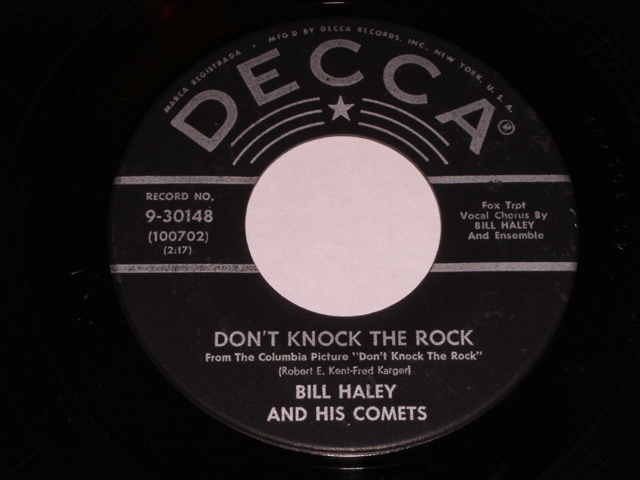 This is a vintage 45 rpm phonograph record by Bill Haley and His Comets, entitled, "Don't Knock The Rock". Flipside: "Choo Choo Ch'Boogie". Record label Decca 9-30148.