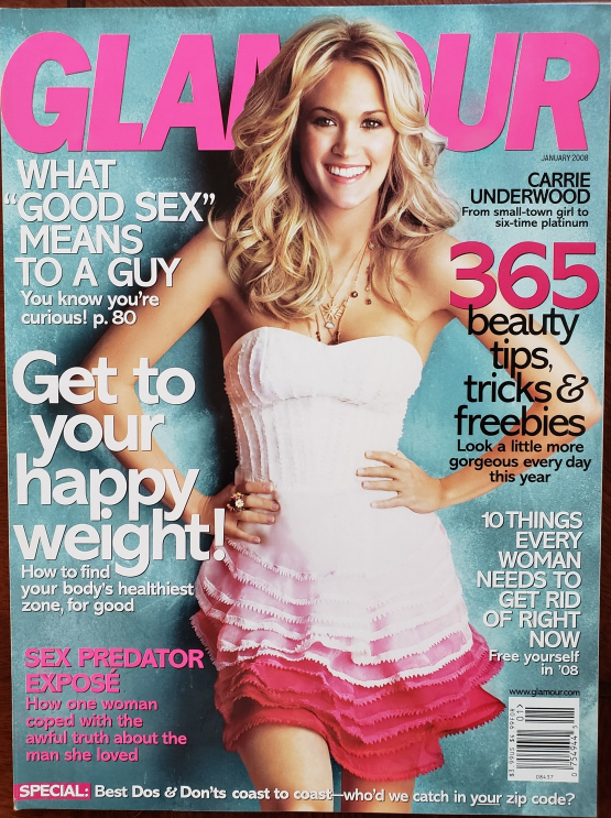 Glamour Magazine January 2008 features on cover, Carrie Underwood, from small-town-girl to six-time platinum.