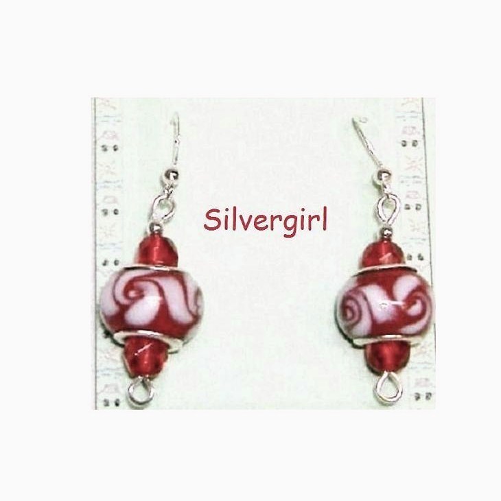 This is a pair of lovingly crafted earrings made with 10 x 12mm hand created red with white swirls lamp work glass beads with Sterling Silver ends and center, 2 6mm red faceted glass beads and SS ear wires. These earrings are 1 1/2" long in total.