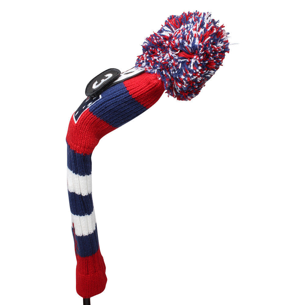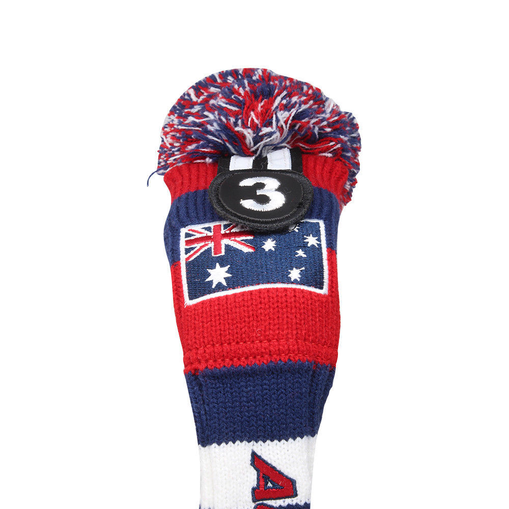 Australia Knit Pom Pom Head Cover. The Patriotic Classic Pom Pom Headcover look revisited with Majek style. Knit covers with a ton of happy details - bold stripes, floppy pom poms and the recognizable flag for an old school charm. The pom pom knit head covers make a great gift for any golfer and are the perfect golf bag accessory.