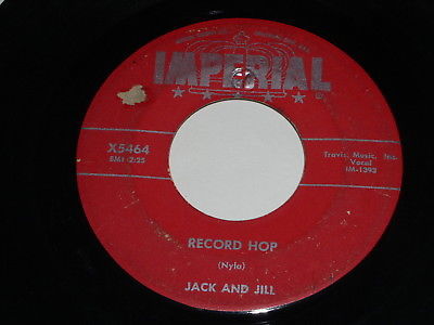 This is a vintage 45 rpm phonograph record by Jack And JIll, entitled, "Record Hop". Flipside: "No One To Talk To". Record label: Imperial X5464.