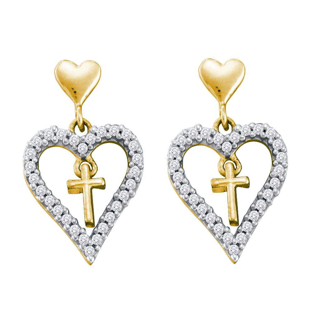 14kt Yellow Gold Womens Round Diamond Heart Cross Dangle Earrings 1/3 Cttw