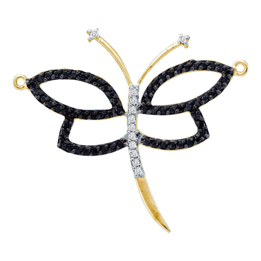 14kt Yellow Gold Womens Round Black Color Enhanced Diamond Dragonfly Bug Pendant 3/8 Cttw