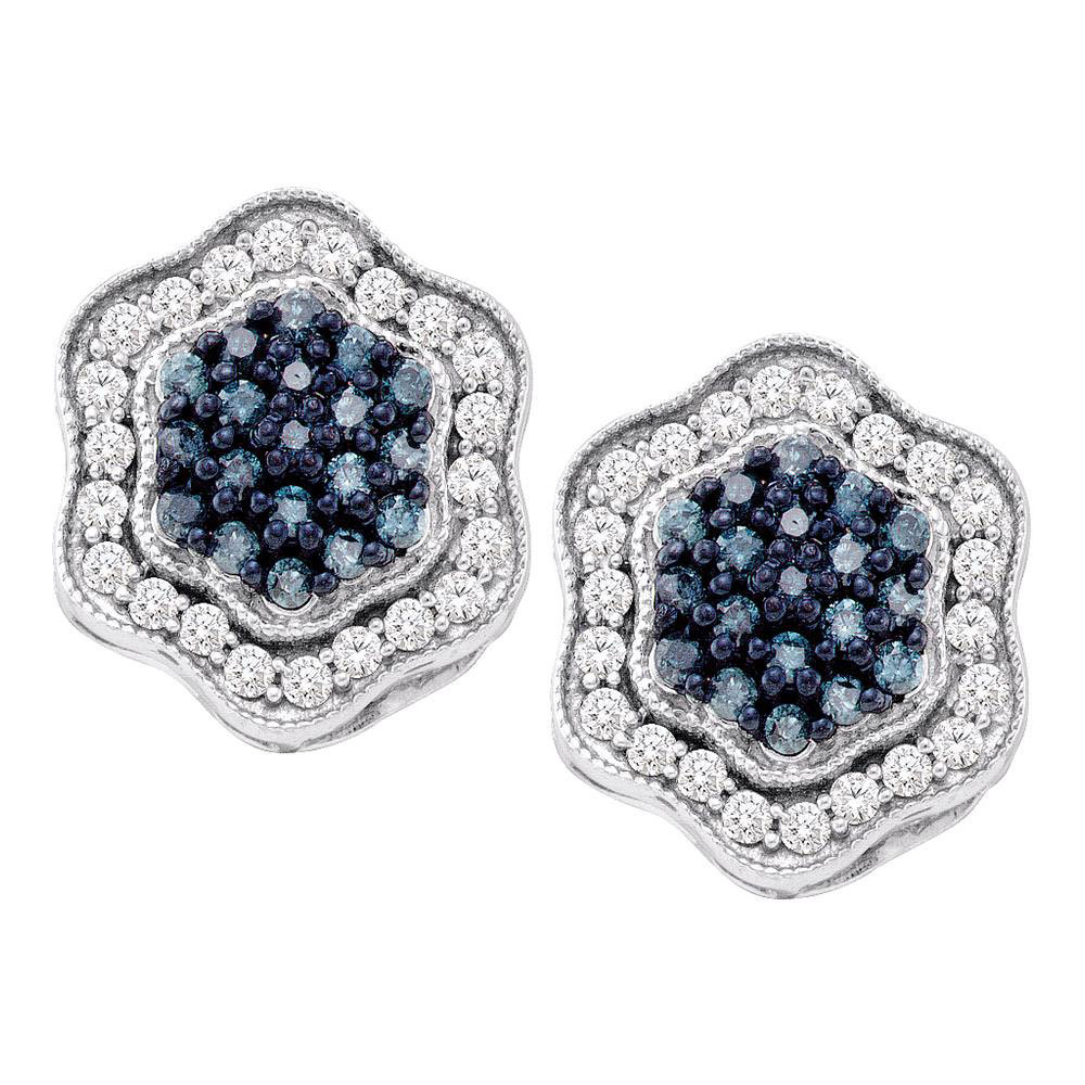 10kt White Gold Womens Round Blue Color Enhanced Diamond Hexagon Cluster Earrings 3/4 Cttw