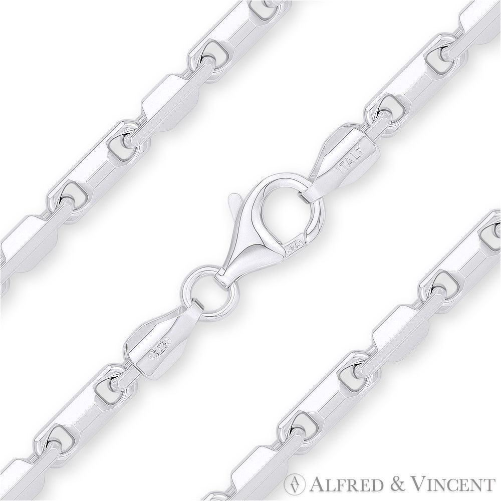 The featured Italian-made 4mm bar chain bracelet is made up of faceted heshe links cast in solid .925 sterling silver and finished with a lobster clasp for secure wear.