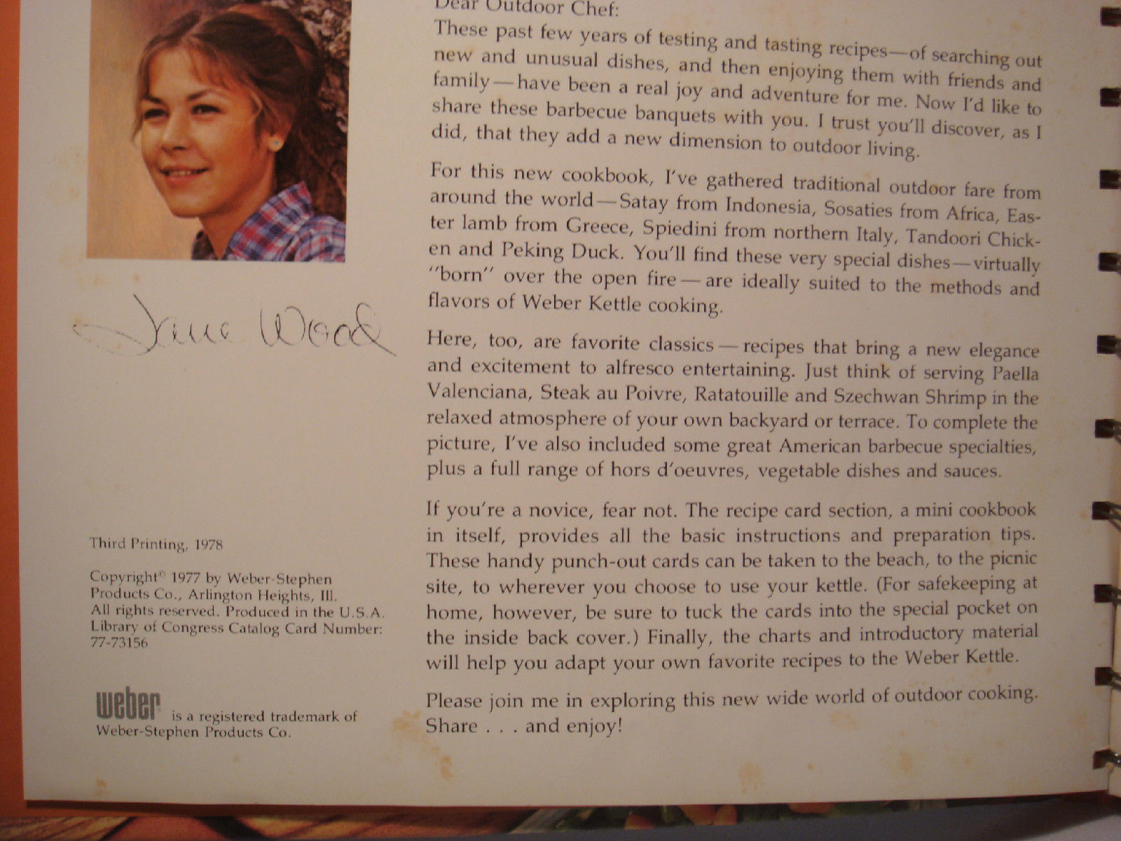 For this new cookbook, I've gathered traditional outdoor fare from around the world.......Satay from Indonesia, Sosaties from Africa, easter Lamb from Greece, Spiedini from Northern Italy, tandoori Chicken and Peking Duck. You'll find these very special dishes.......virtually born over the open fire............are ideally suited to the methods and flavors of Weber Kettle Cooking!