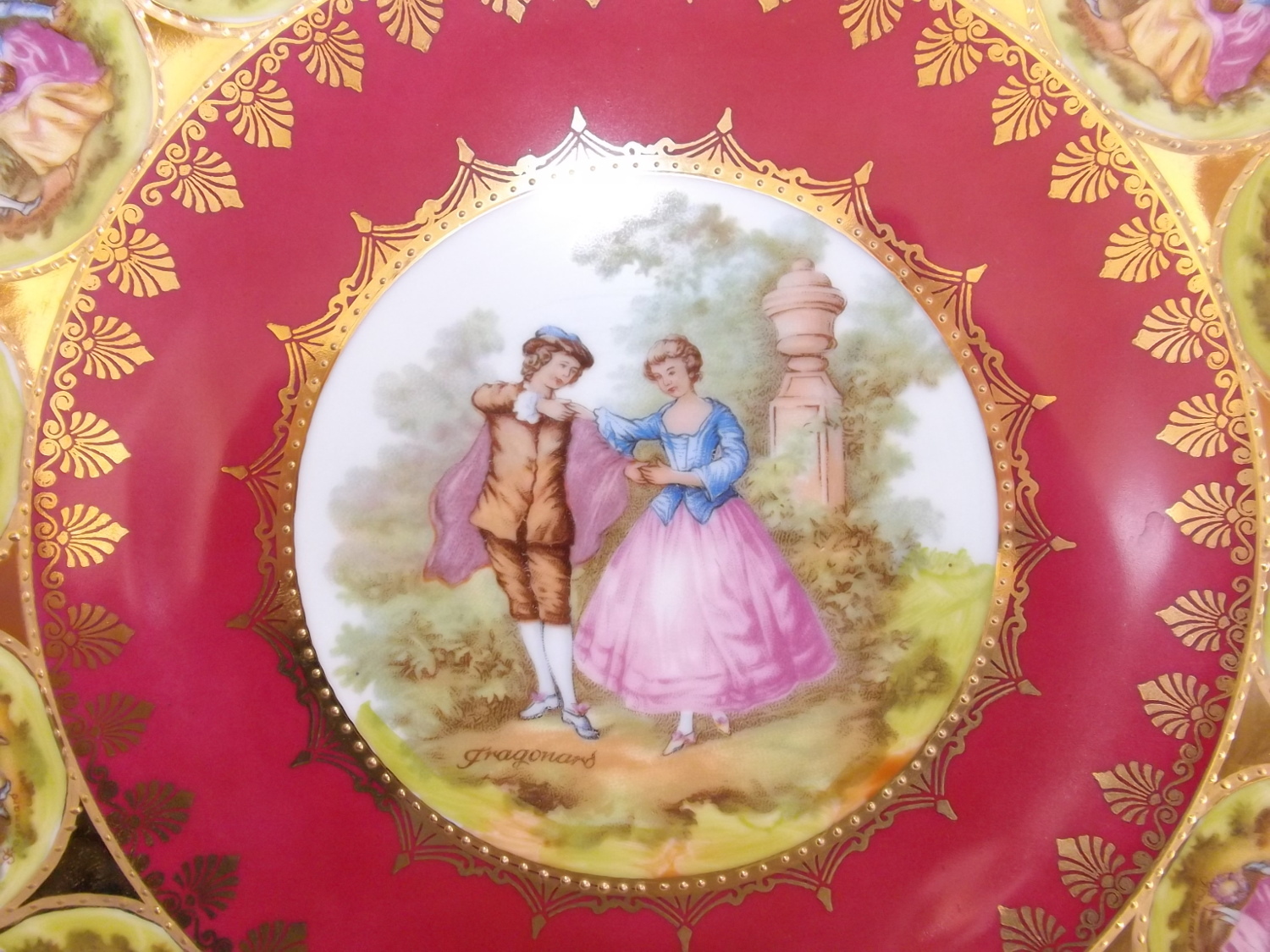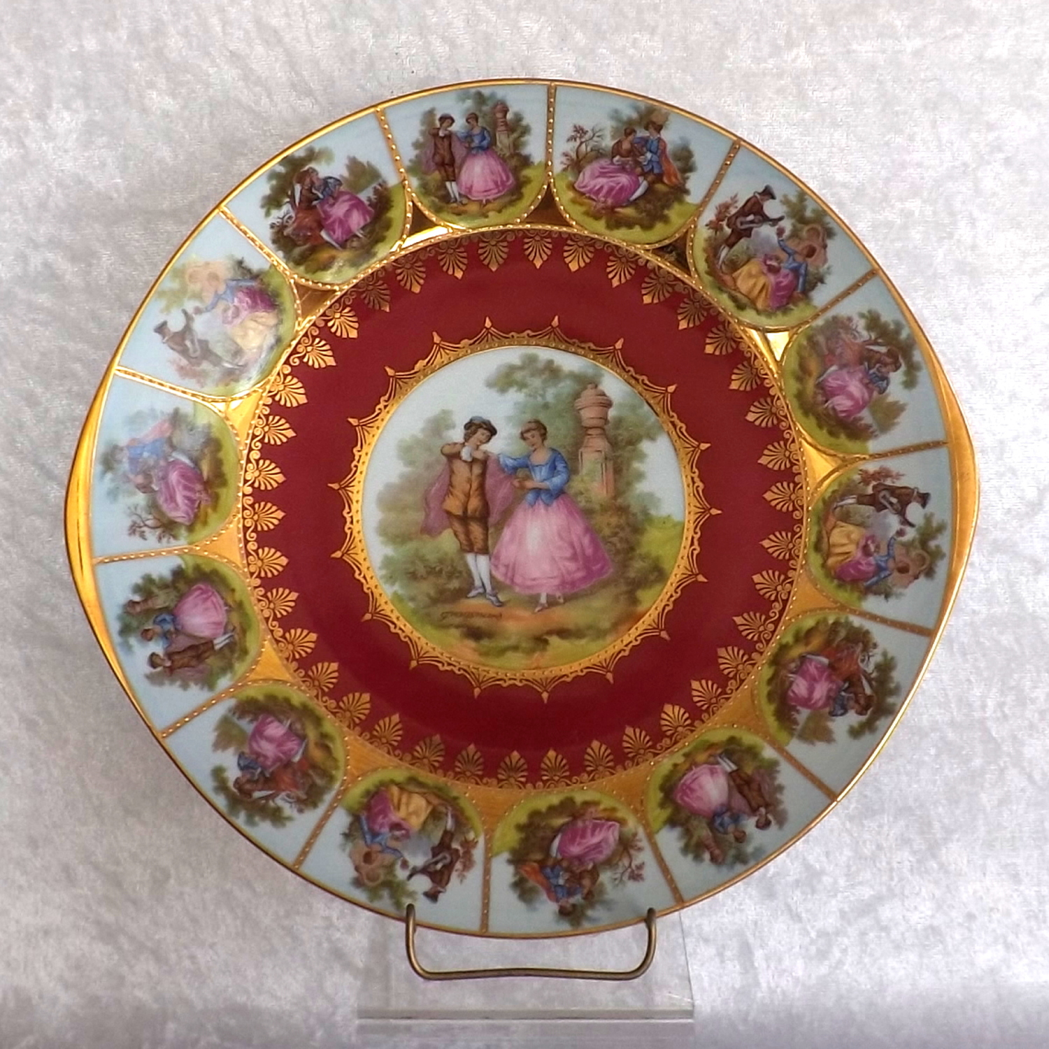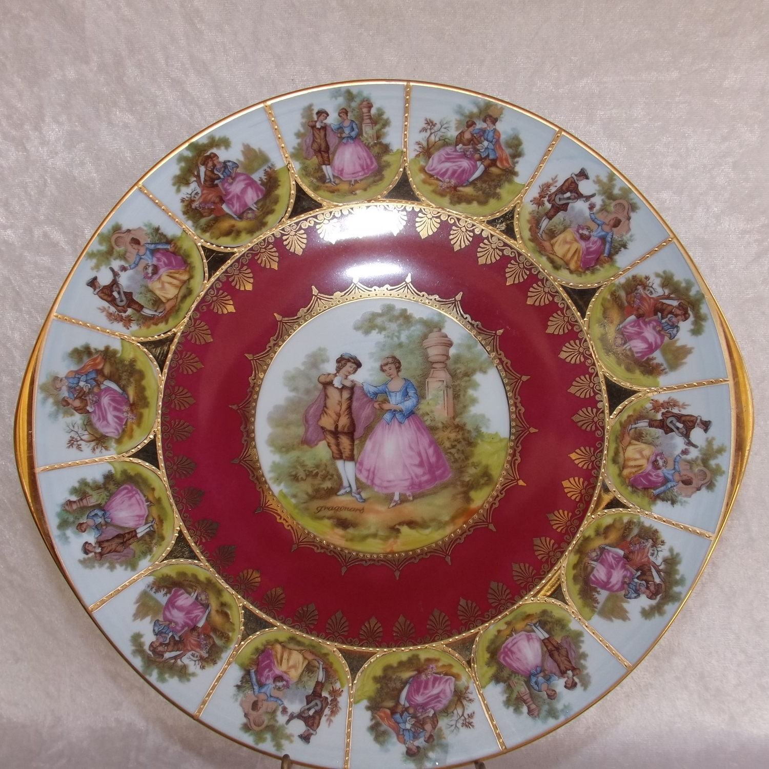 This is a beautiful piece with a Love Story pattern, figural scenes in transfer and reproduced from the work of Fragonard, a French Rococo-era artist from the late 1700's. whose work has been reproduced by in countless factories and decorating studios, This plate was produced between 1940 -1950.