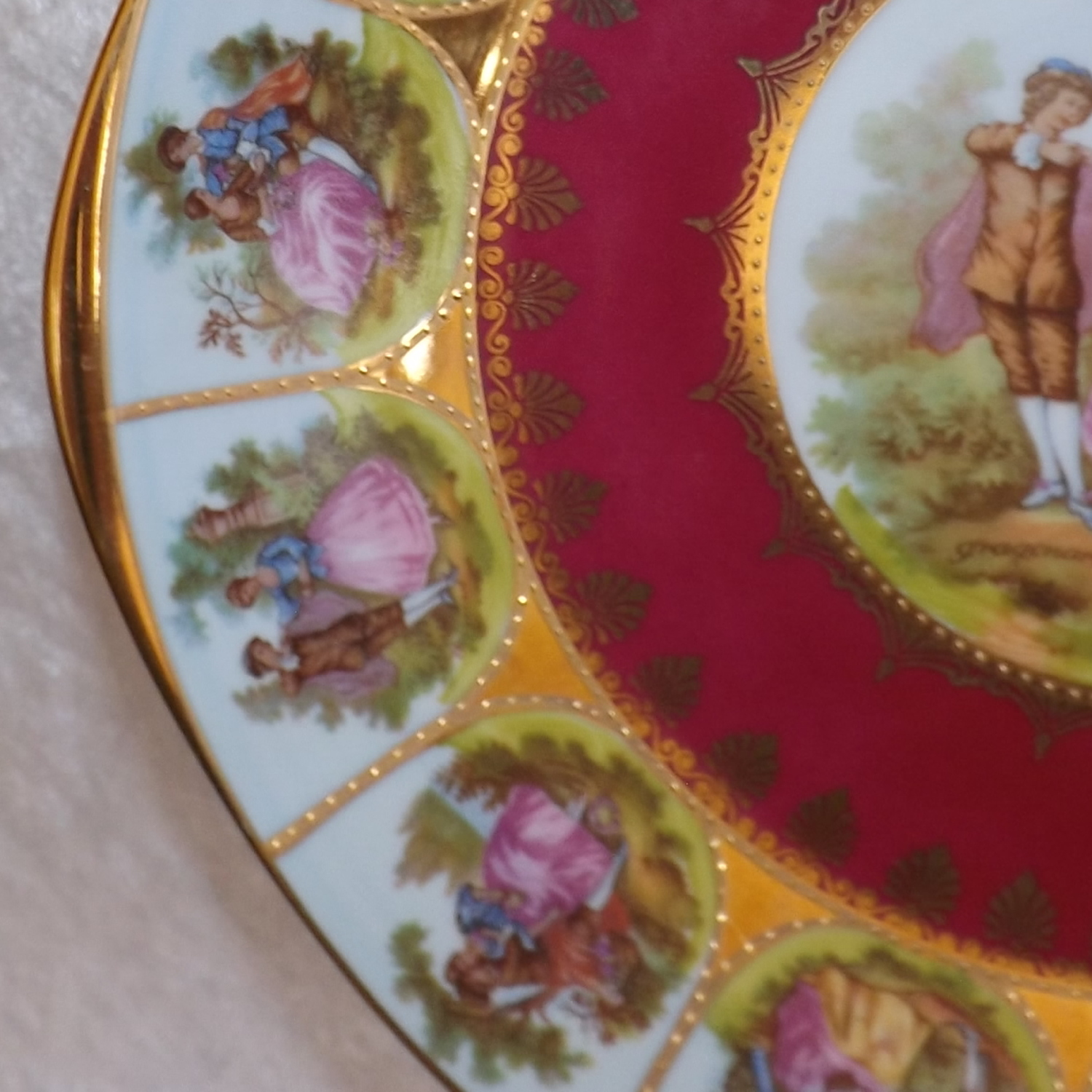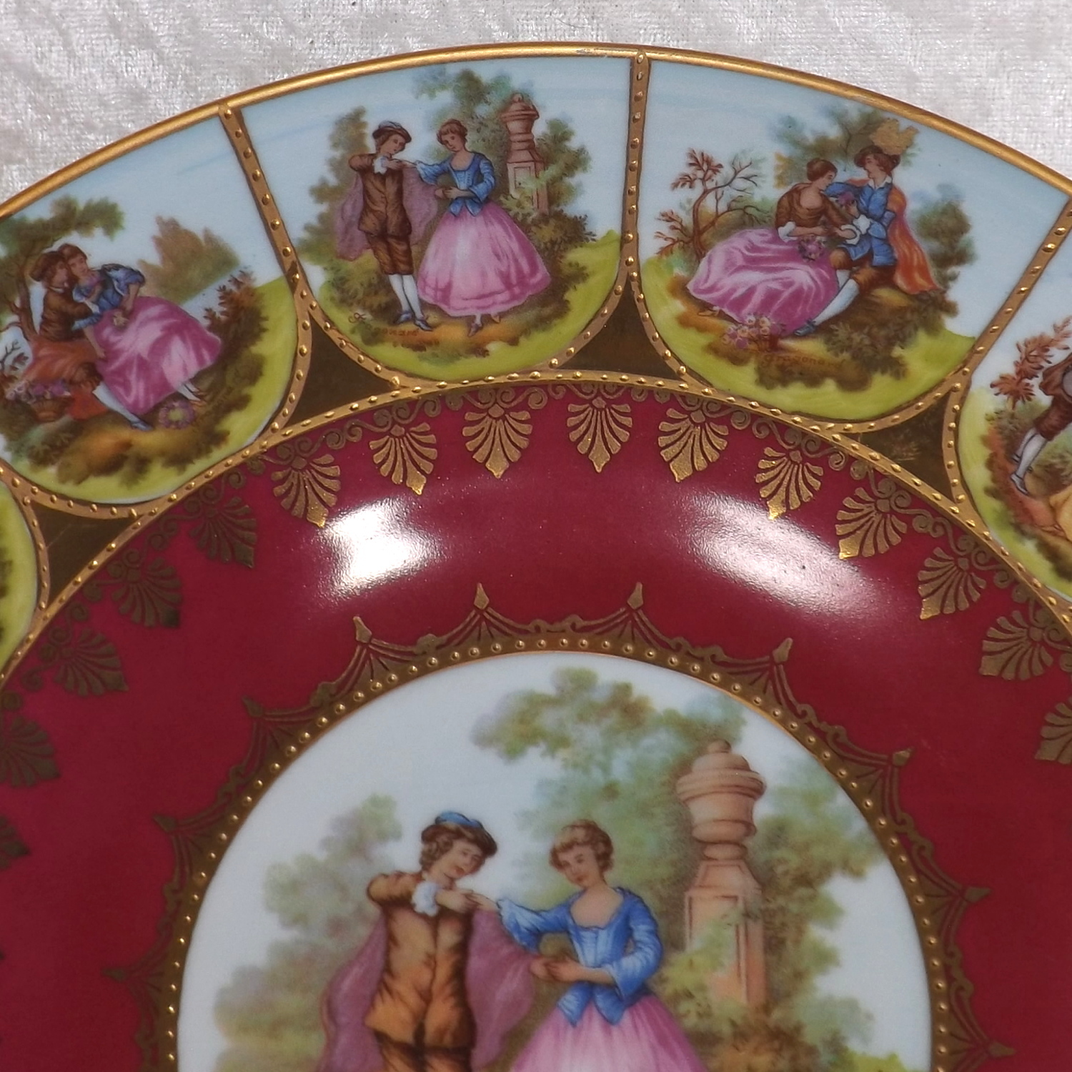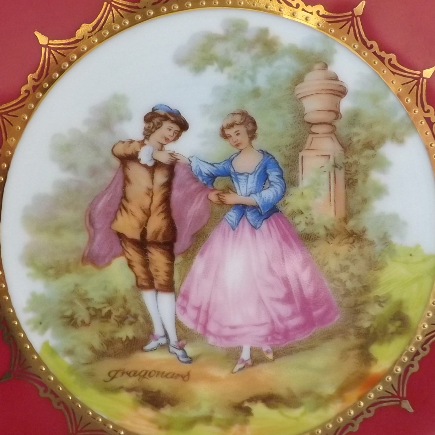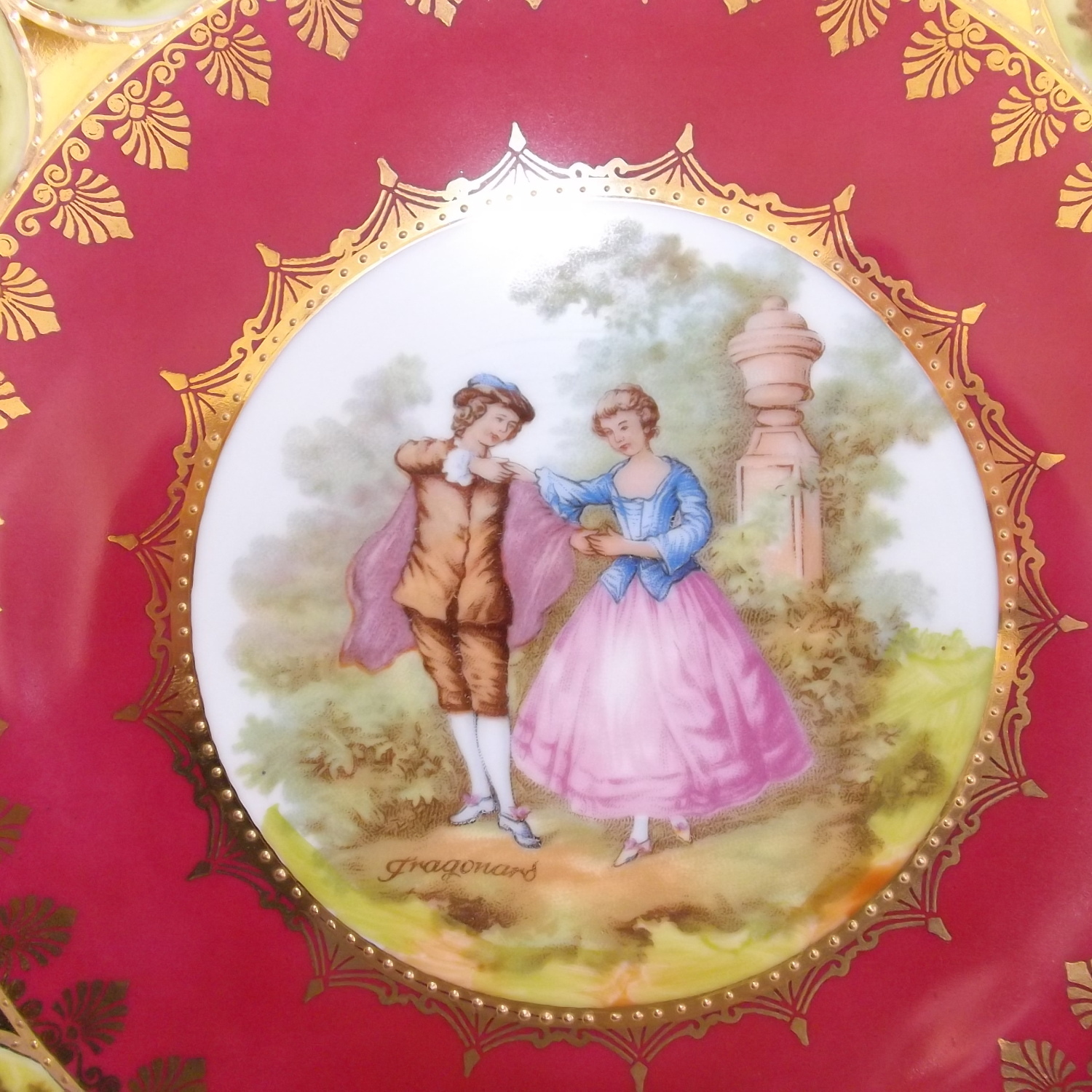 This is a beautiful piece with a Love Story pattern, figural scenes in transfer and reproduced from the work of Fragonard, a French Rococo-era artist from the late 1700's. whose work has been reproduced by in countless factories and decorating studios, This plate was produced between 1940 -1950.