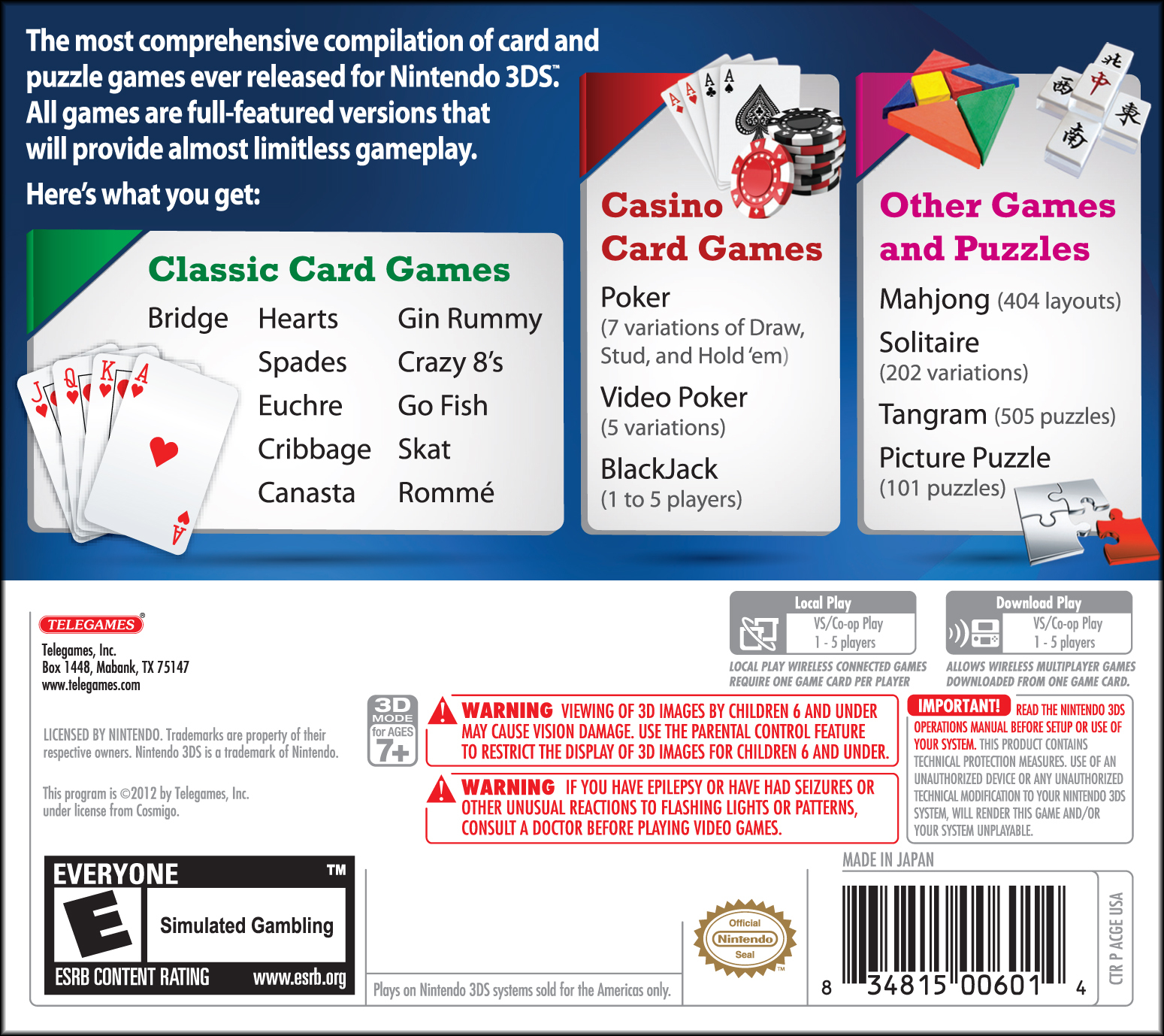 The most comprehensive compilation of card and puzzle games ever released for Nintendo 3DS. All games are full-featured versions that will provide almost limitless gameplay. Here’s what you get: