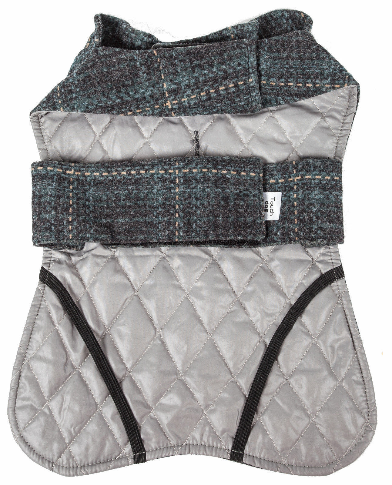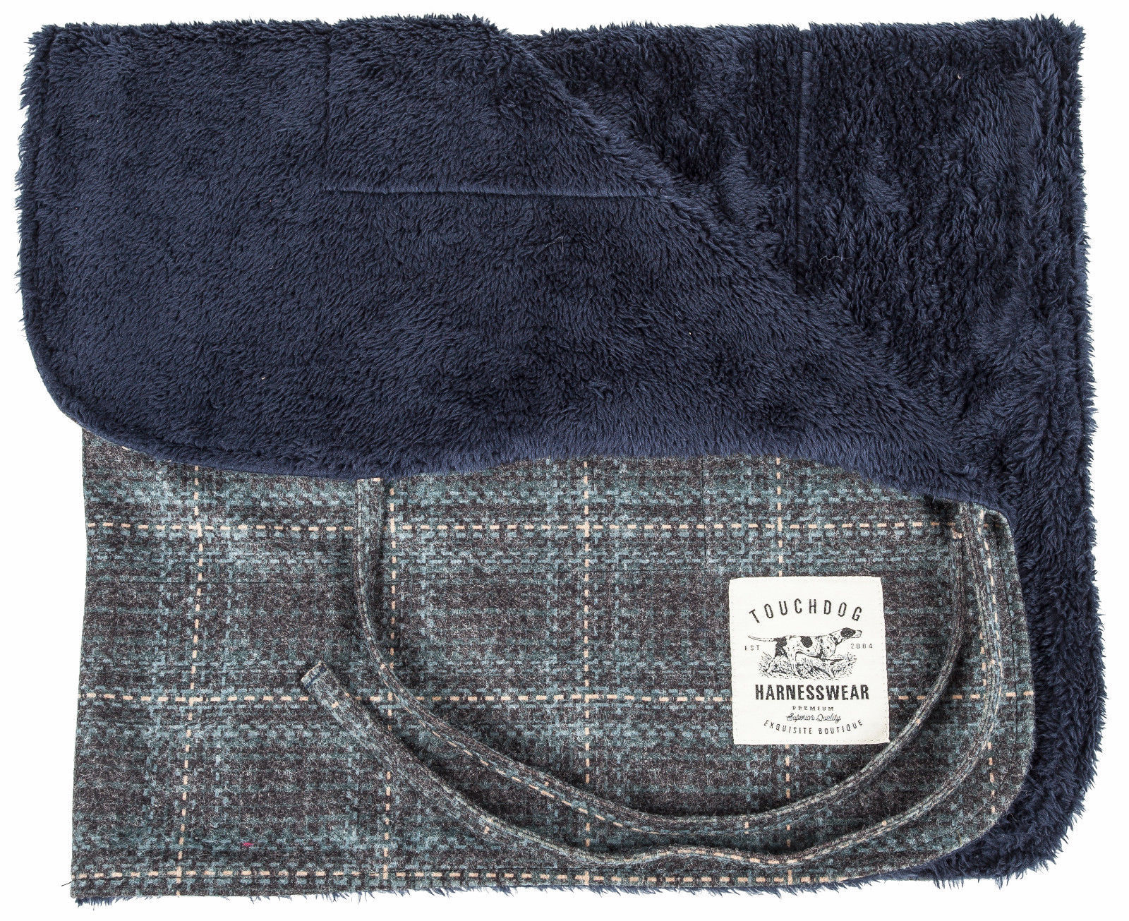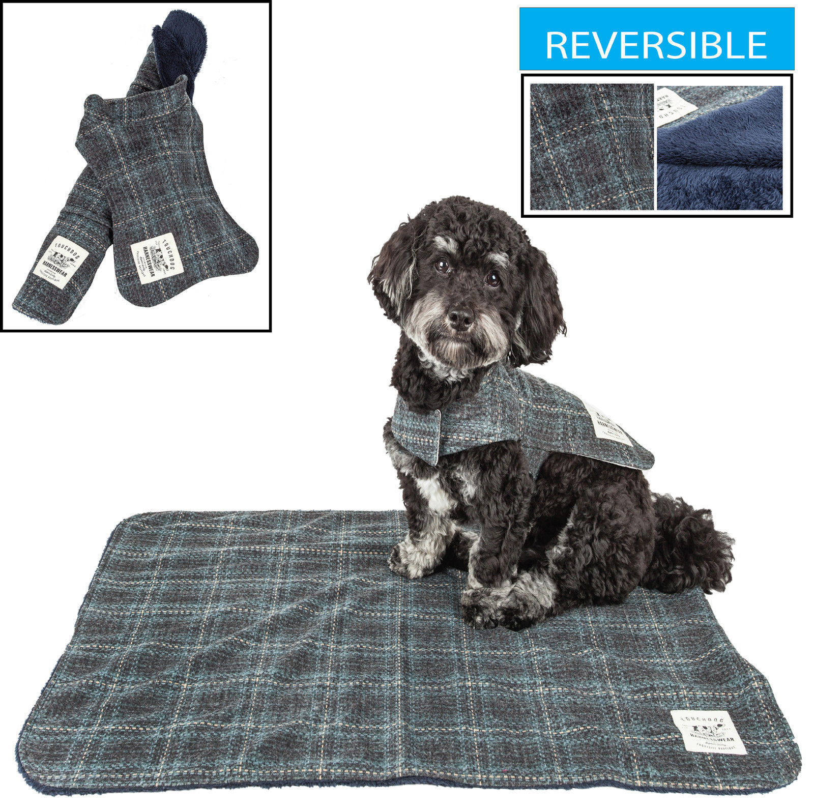 The Touchdog 2-in-1 Windowpane Plaided Dog Jacket with Matching Reversible Dog Mat features a matching Slate Gray, Aqua, Green and Beige heathered or mรฉlange windowpane plaided wool treated Exo-shell pattern composed of specially formulated blended exo-shell that is Breathable and slightly Flexible. The Dog Jacket features dual Heavy-Duty belly hook and loop straps below the neck and around the waist and specially inner-lined with Diamond-Stitched High-Grade Polyester with dual expandable leg straps for added stability and a leash slit along the back-side. The Pet Bed is Reversed with a warm and comfortable Soft-to-the-touch Royal blue Sherpa-like treated blended cotton that gently hugs the body. The Pet Mat also features dual straps that wrap around and tie when rolled up. The is sold as a 2-piece matching set. The Dog Mat Dimensions vary based off of the Jacket sizing, read below for sizing. Available in Multiple Colors and Sizes.