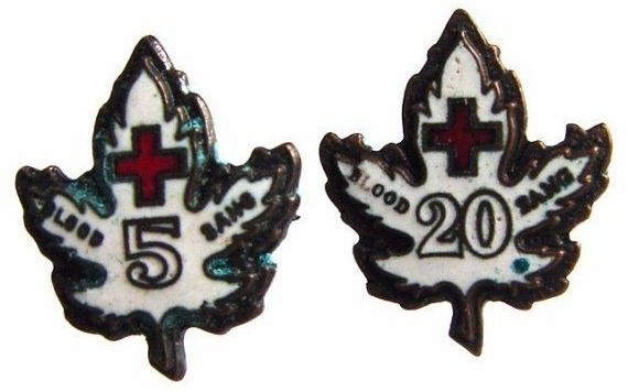 In this sale I am offering the Canadian Red Cross blood donor 5 and 20 enamel maple leaf pins lot.