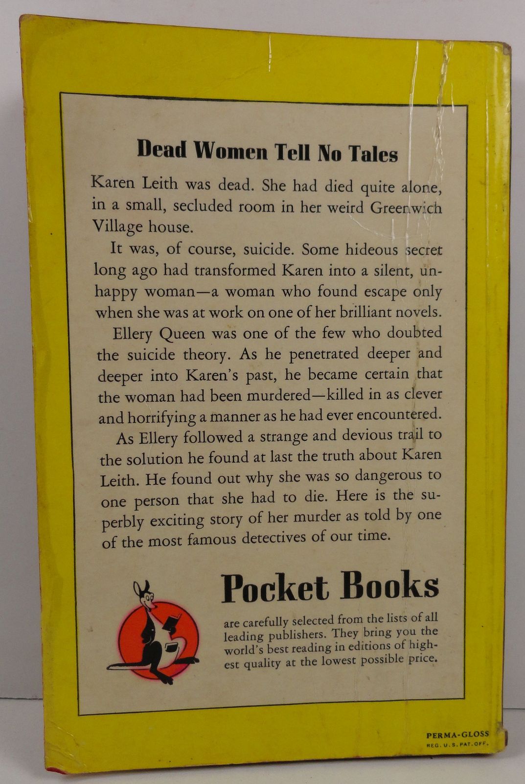Karen Leith was dead. She had died quite alone, in a small, secluded room in her weird Greenwich Village house. It was, of course suicide. Some hideous secret long ago had transformed Karen into a silent, unhappy woman-a woman who found escape only when she was at work on one of her brilliant novels. Ellery Queen was one of the few who doubted the suicide theory. As he penetrated deeper and deeper into Karen's past, he became certain that the woman had been murdered-killed in as clever and horrifying a manner as he had ever encountered. (#00001598)