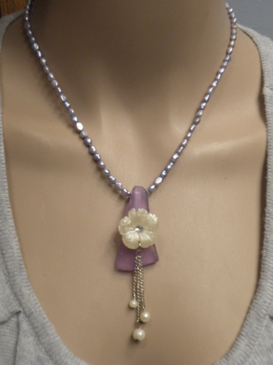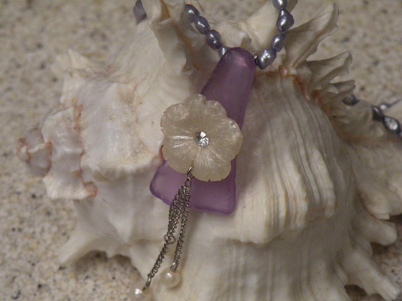 .....This lovely feminine necklace consists of a genuine carved MOP pearl flower with a sparkly crystal in the center, that I attached to a beautiful piece of beach glass...,. it has 3 small genuine pearls that dangle from a silver color chain.....The pendant is on a beaded freshwater genuine pearl necklace.