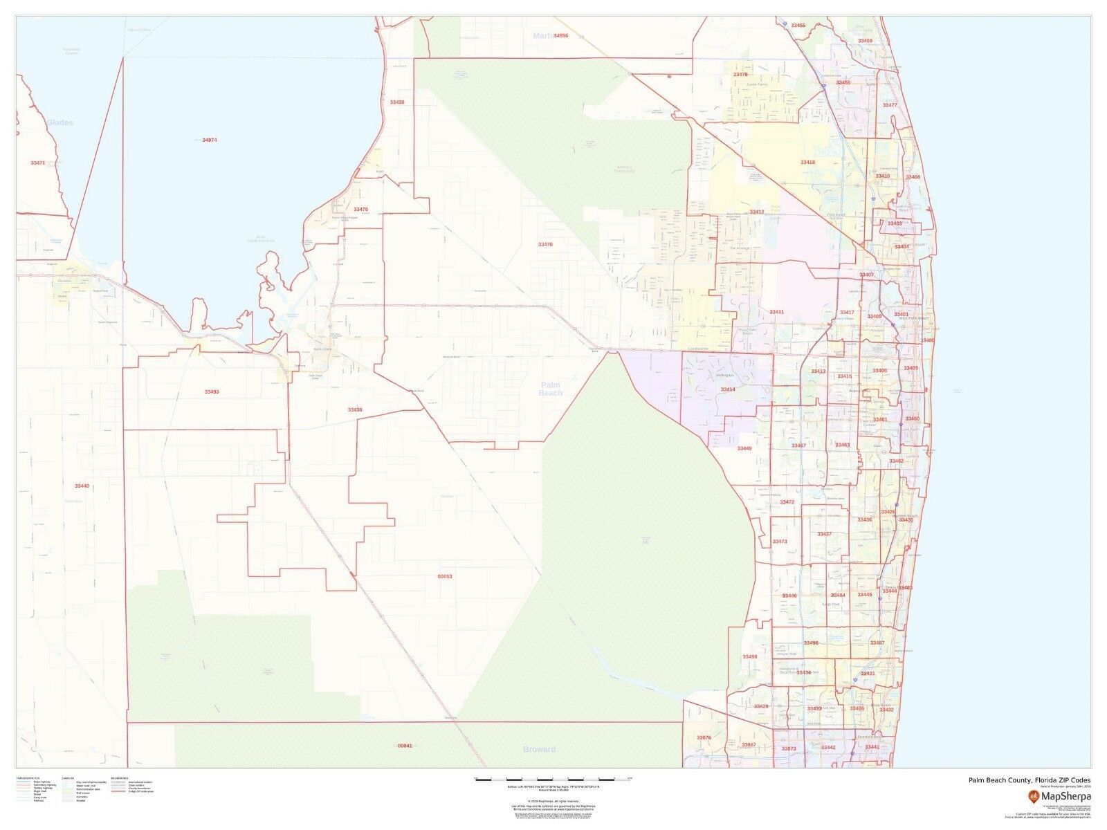 This map of Palm Beach County, Florida shows ZIP code areas overlaid on a road map. Ideal for planning of deliveries, home services, sales territories, real estate and much more. Base map features include all roads with major roads and highways labelled; neighborhood names; railways; and high level land use such as parks and recreation areas, industrial areas and hospital campuses.