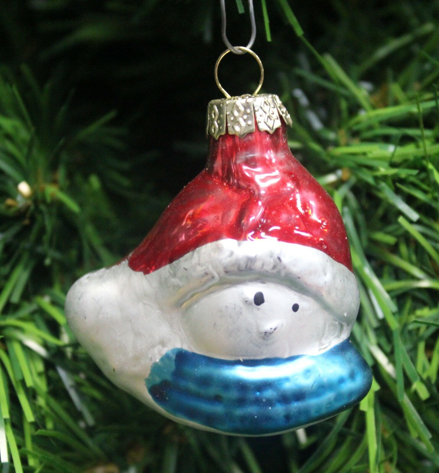 BRAND NEW NEVER DISPLAYED HAND BLOWN PAINTED MERCURY STYLE GLASS MINI SNOWMAN WITH RED SANTA HAT AND BLUE SCARF CHRISTMAS TREE ORNAMENT !