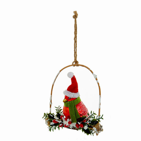 Beautifully Hand Painted Decorated Cardinal Perched Upon a Wooden Twig Branch Swing. The Branch is Brown with Snow Capped Iridescent Glitter and is Decorated with Holly. The Red Cardinal Bird wears a Holiday Hat and Green Scarf and is Hand Painted and Detailed with Glitter Accents.