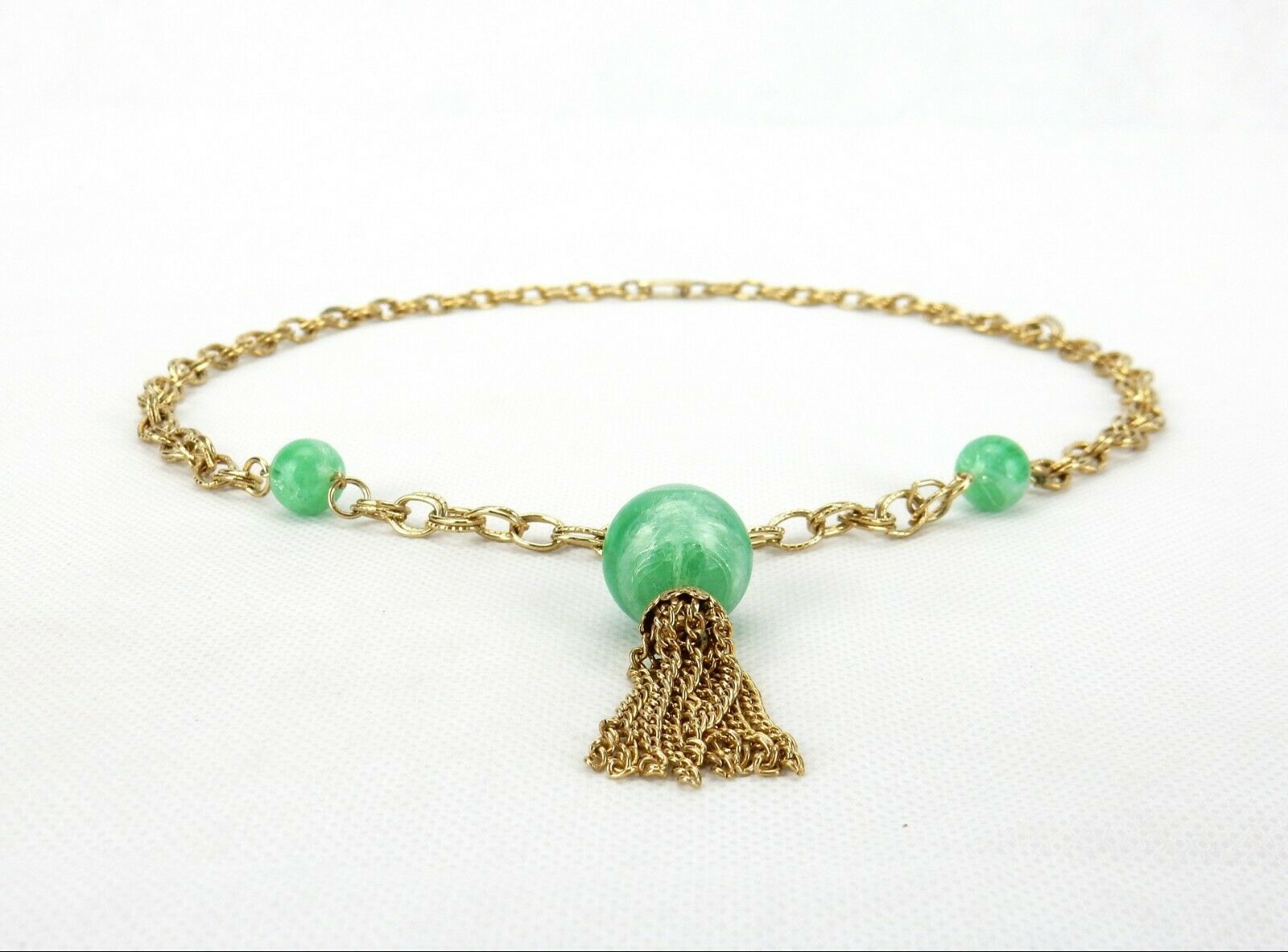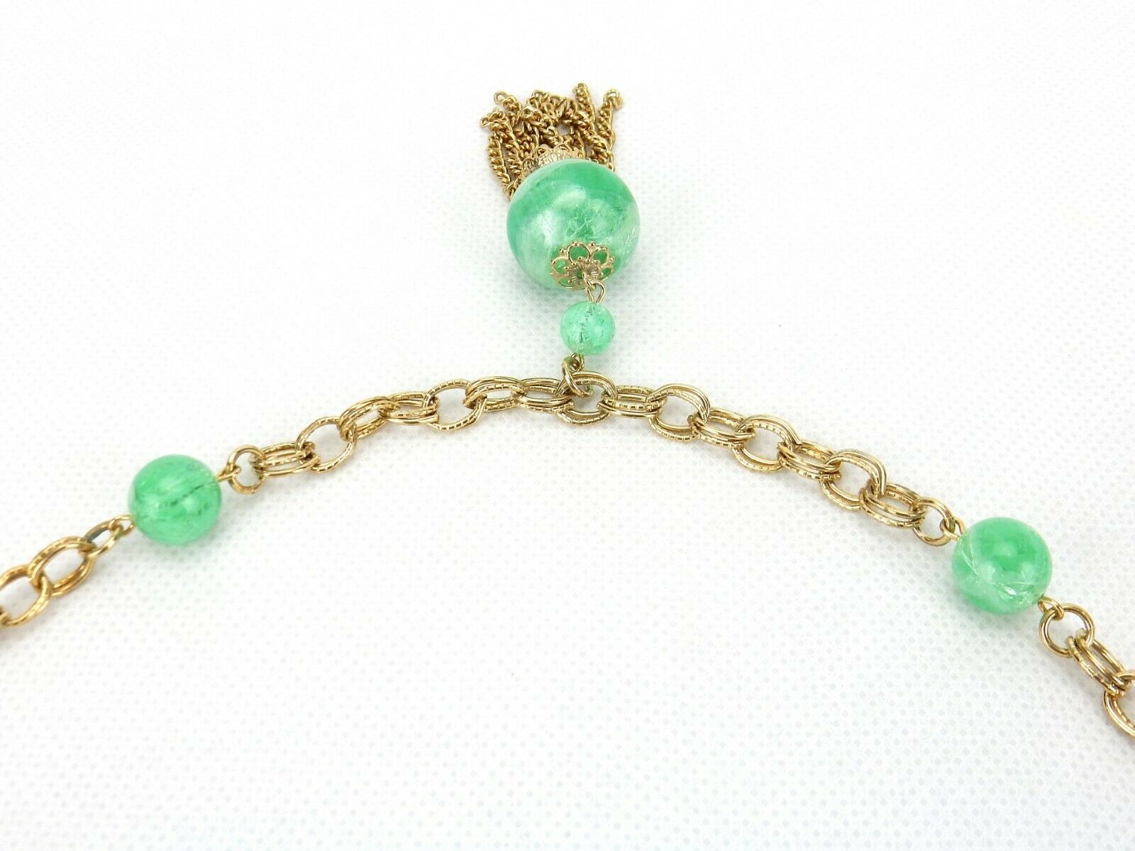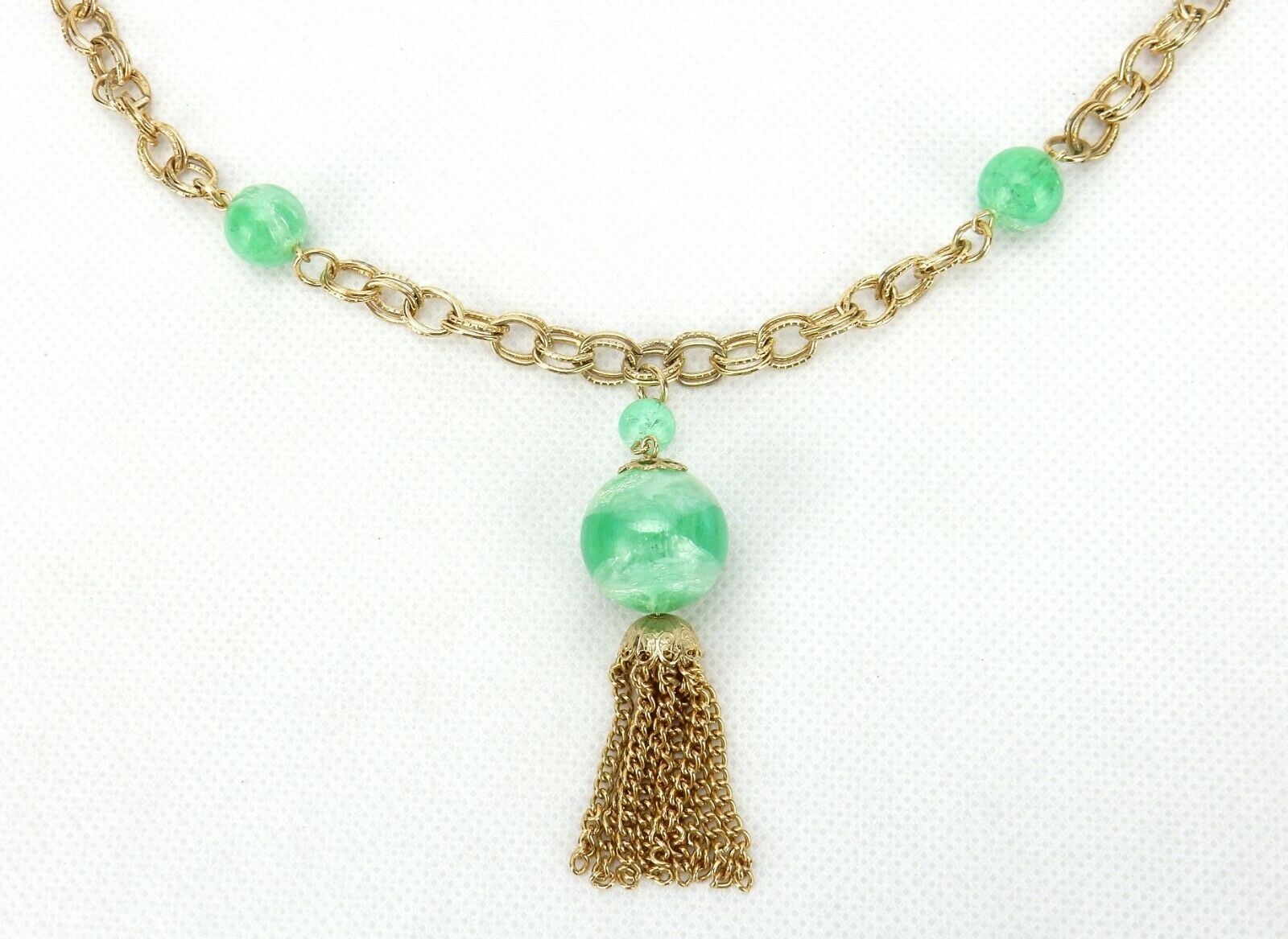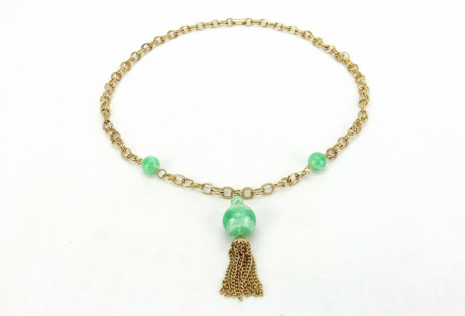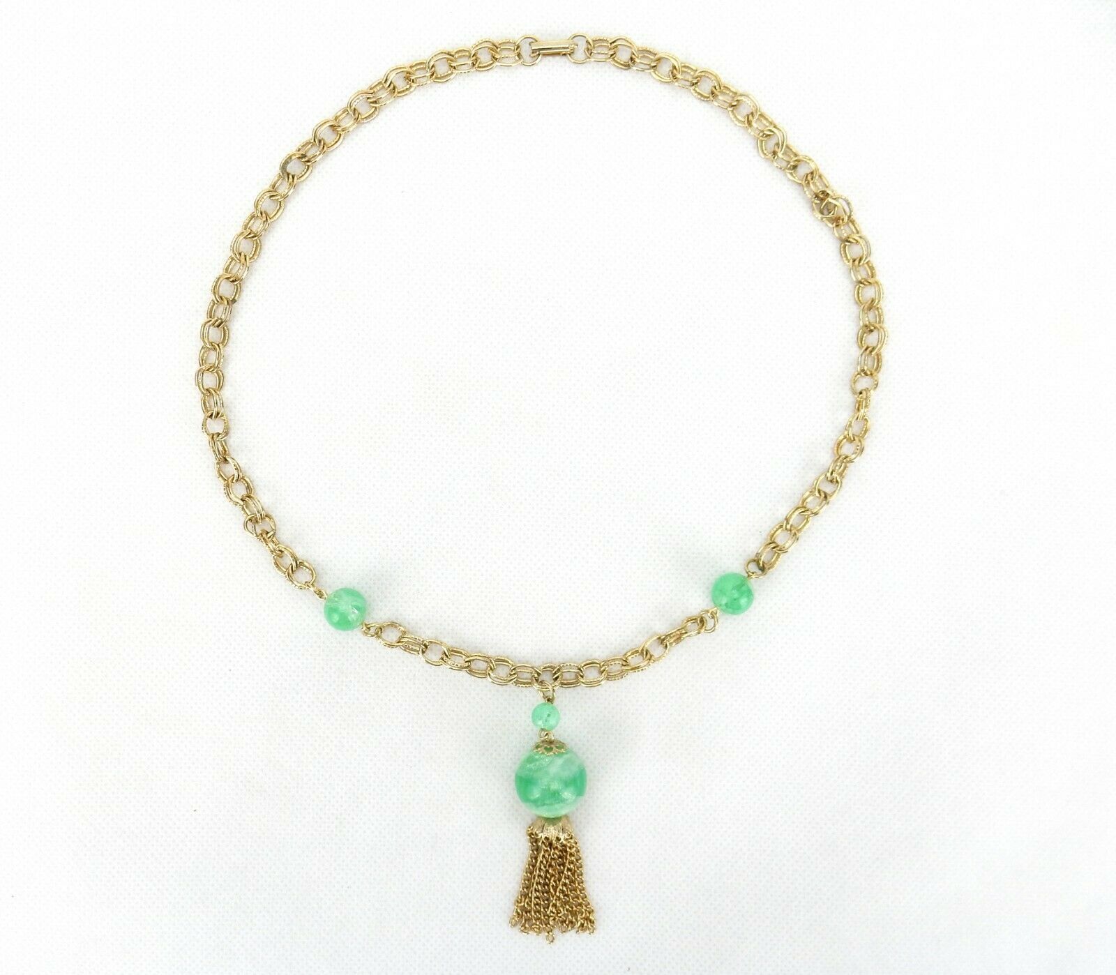 Vintage Costume Jewelry, Gold Tone Link, Green Bead Lariat Tassel Necklace NK95