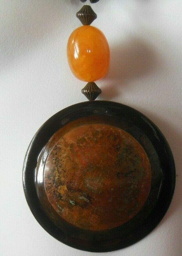 Vintage Glass/Plastic Bead Large Pendant Black Twisted Rope Cord Necklace