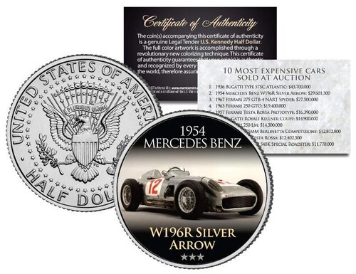 Here is your opportunity to own or gift the ?MOST EXPENSIVE CARS SOLD AT AUCTION - 1957 FERRARI ? 250 TESTA ROSSA? U.S. colorized JFK Kennedy Half Dollar U.S. Coin, which has been enhanced with a beautifully colorized image by the Merrick Mint. Each coin comes in a premium coin capsule with a full color Certificate of Authenticity to guarantee that your coin is authentic and recognized by every monetary authority around the world, assuring its Collector Edition status. This Legal Tender United States coin has been colorized with an application of special inks directly to the surface of the coin, using a unique and painstakingly multicolor coin process, which achieves a level of detail, color saturation, and durability that is #1 in the coin industry. The result is an everlasting colorized coin collectible of ultra-high quality. The Kennedy half dollar is a U.S. fifty cent coin with coin year and mint marks chosen at random.