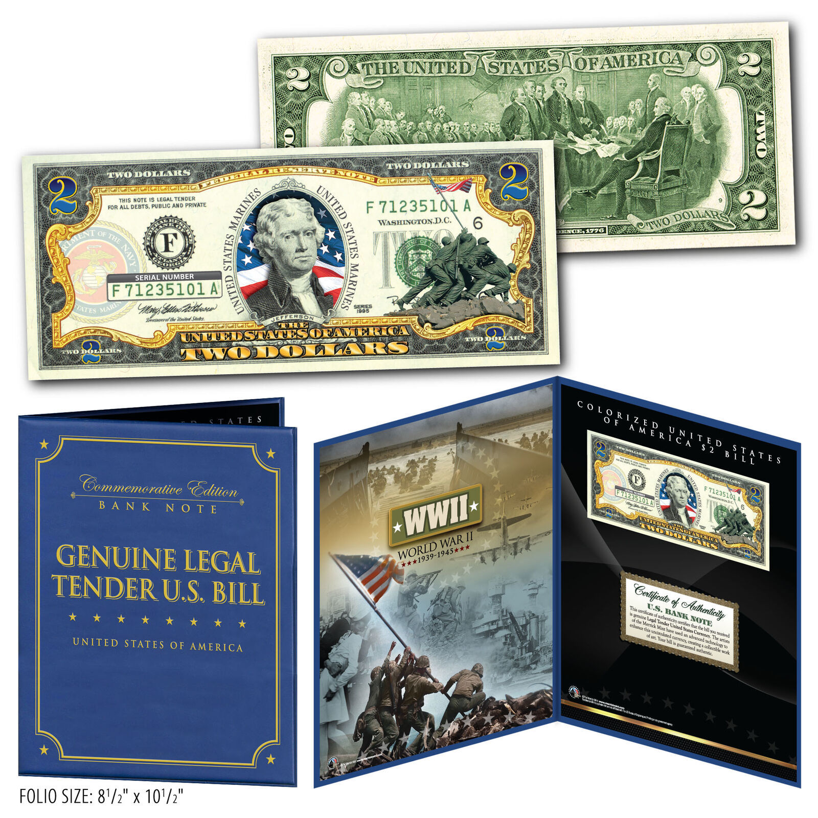 This Limited Collector Edition item features a Legal Tender Authentic Colorized MARINES World War II WWII Vintage Genuine $2 Bill. On the Left side is a Collector?s Edition 8 x 10 photo. Both items are beautifully showcased in a Special Gold Foil Museum-Quality Display Folio, that comes complete with Built-in Manufacturer's Certificate of Authenticity and Premium Collectors 8 x 10. This item Measures 10.5" x 8.5 (closed) and 10.5? x 17? (open). Each Premium Collector Display is a Limited Edition. Don?t Miss Your Chance to Order?Very Limited Quantity Available! Whether as a part of your growing collection or a gift to that great collector in your life, don't miss out on this incredible opportunity -- especially at this unbelievable value! Made in USA.