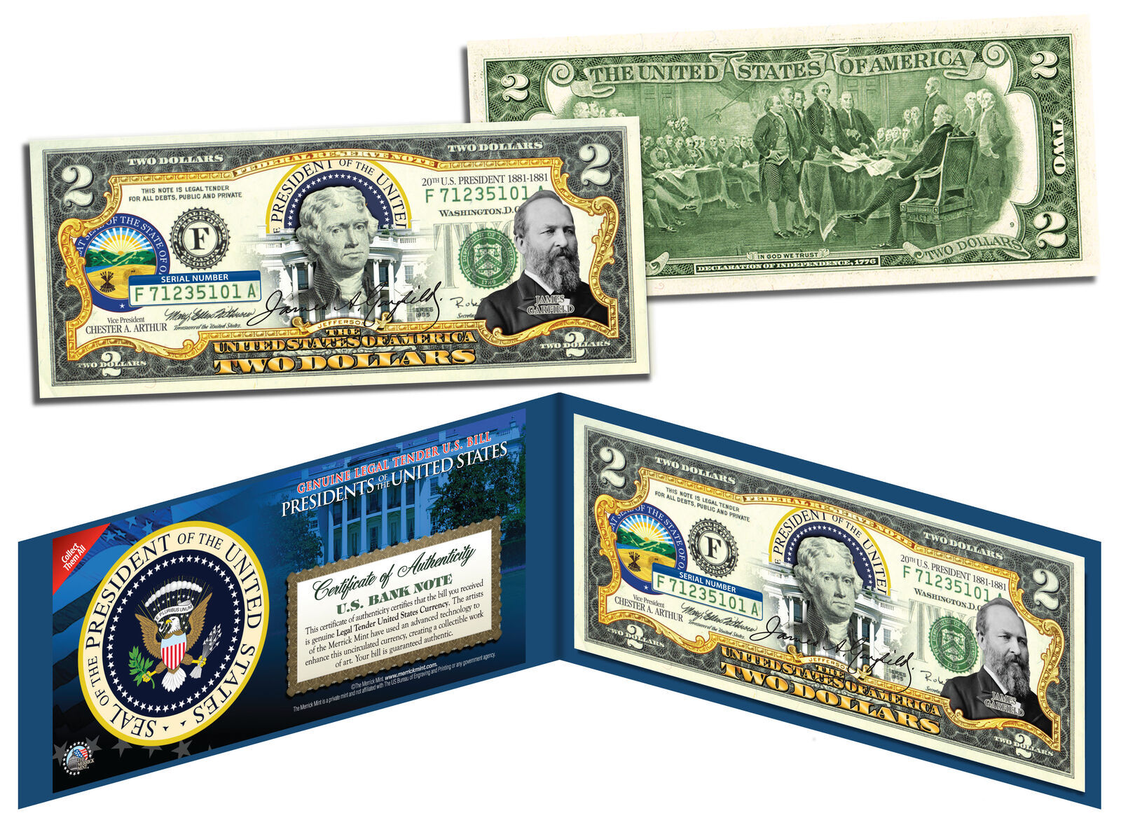 The PRESIDENT JAMES A. GARFIELD uncirculated $2 Bill is Genuine Authentic Legal Tender of the United States, which has been enhanced with a beautiful colorized image of the President and the Seal of the State of his birthplace on the obverse of the bill. The full colorized images are accomplished through a revolutionary new authentic genuine colorization process pioneered by The Merrick Mint. Included is a Certificate of Authenticity to guarantee that your bills are authentic and recognized by every monetary authority around the world, and assuring its Collector Edition status. Each $2 Bill is in FRESH, CRISP, UNCIRCULATED condition, and was directly removed from untouched wrapped Federal Reserve sealed packs. Former U.S. President Thomas Jefferson is featured on the obverse of the note, along with the special colorization overlay. The Signing of the Declaration of Independence by John Trumbull is featured on the reverse. It is the only U.S. Currency note that features two Presidents, John Adams and Thomas Jefferson, and it is one of the most rarely seen BILLS in circulation and actual use.