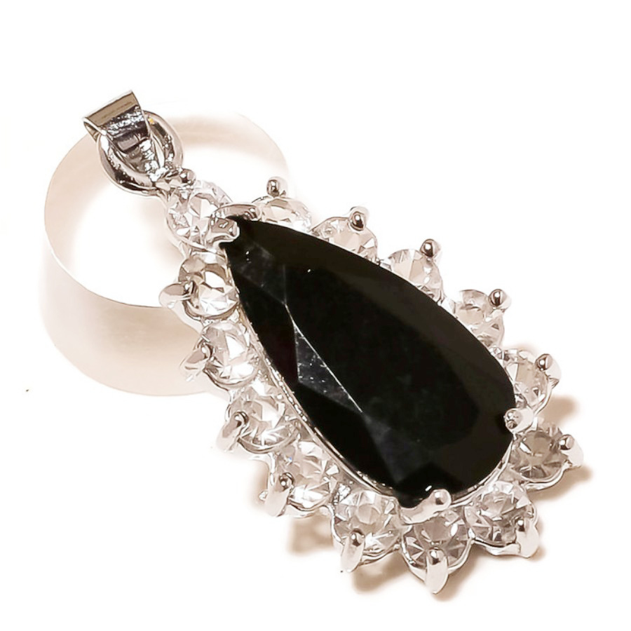 Black Onyx, Cubic Zirconia Gemstone 925 Silver Overlay Handmade Designer Pendant