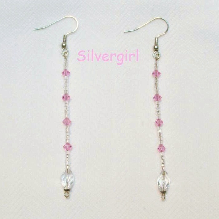 These earrings are lovingly made and are about 3 1/2" long and are made with 4mm rose pink crystal beads, tiny clear glass seed beads, a gorgeous long faceted czech glass bead and topped off with surgical steel silver plated ear wires.