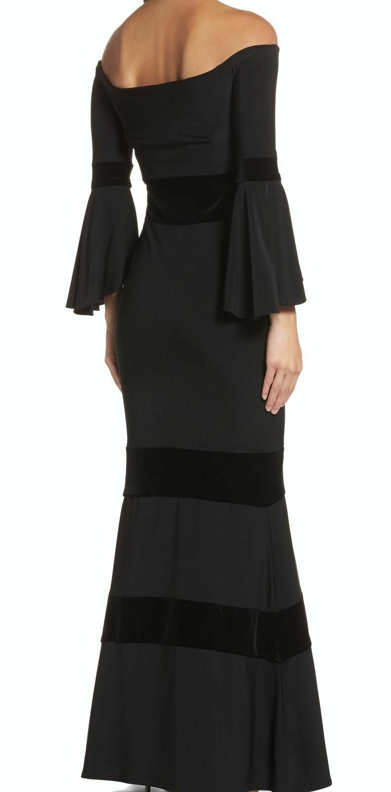 Xscape Velvet Stripe Pattern Off-Shoulder Bell Sleeve Dress 2