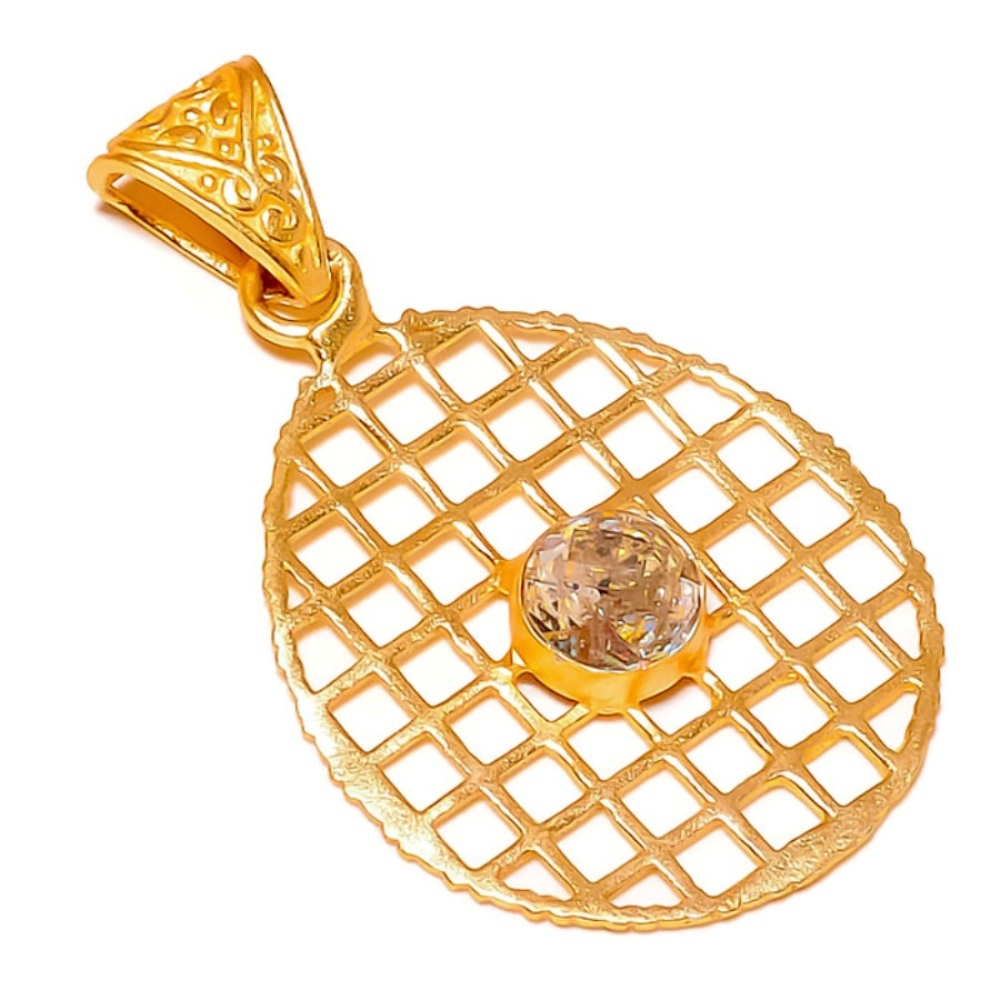 Crystal Quartz Circle Faceted Gemstone Gold Plated Handmade Filigree Pendant