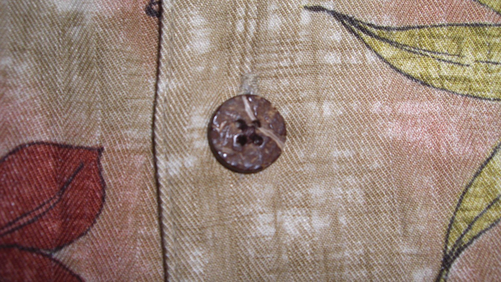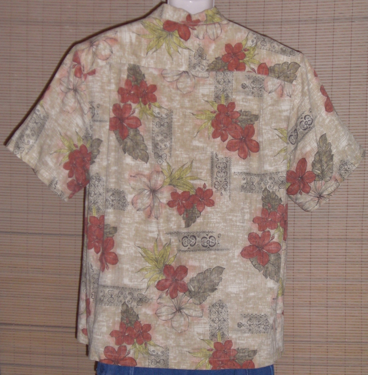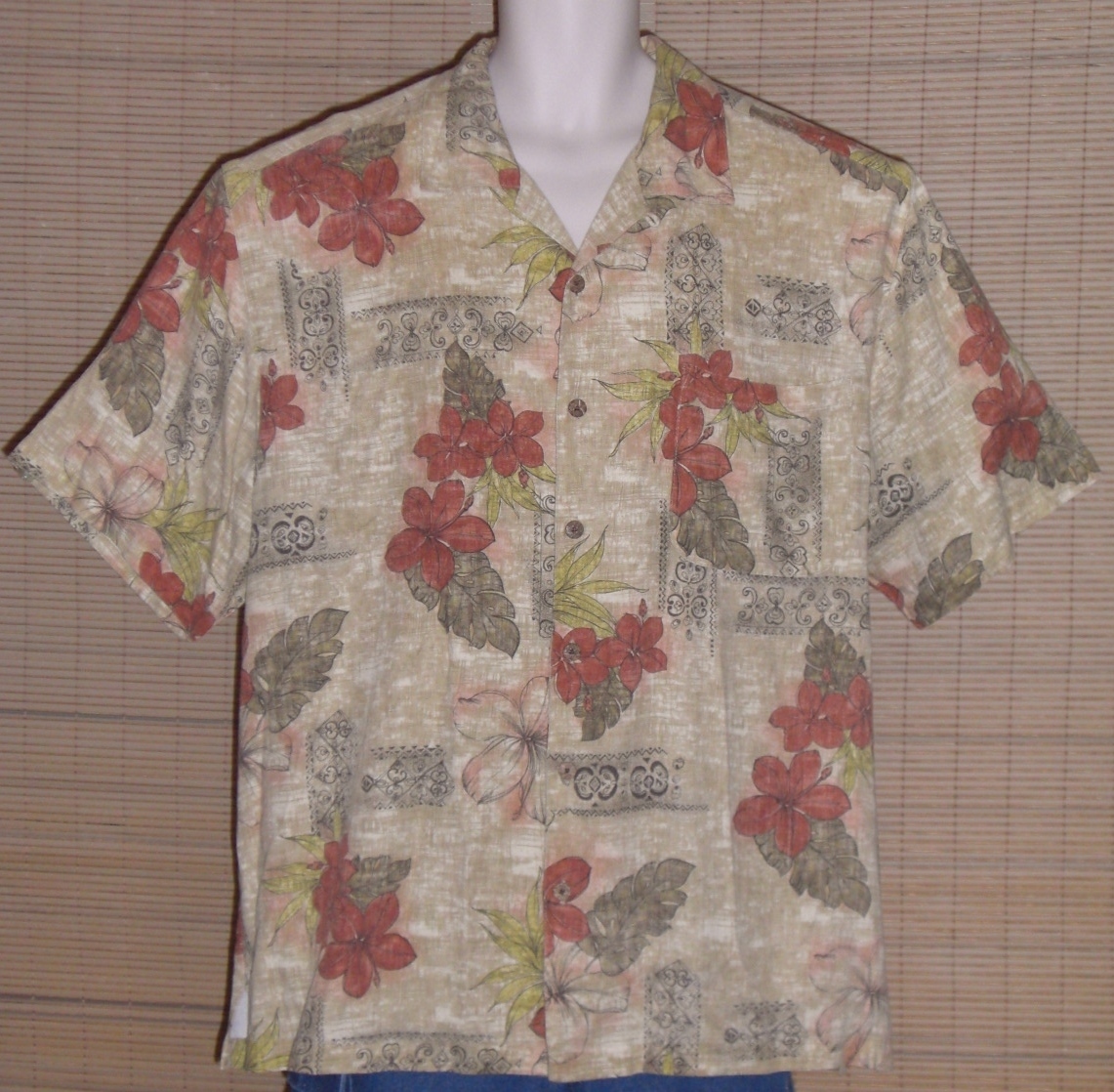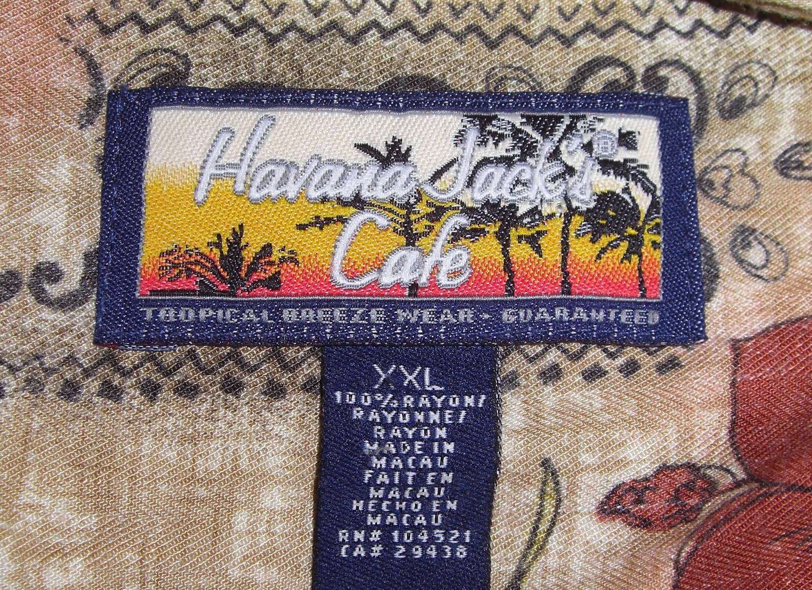 Men’s Havana Jack's Cafe Hawaiian Shirt - Tan and cream background with reddish tropical flowers and black outline swirl borders. Coconut buttons and 1 breast pocket. 100% Rayon. Made in Macao. Size XXL.