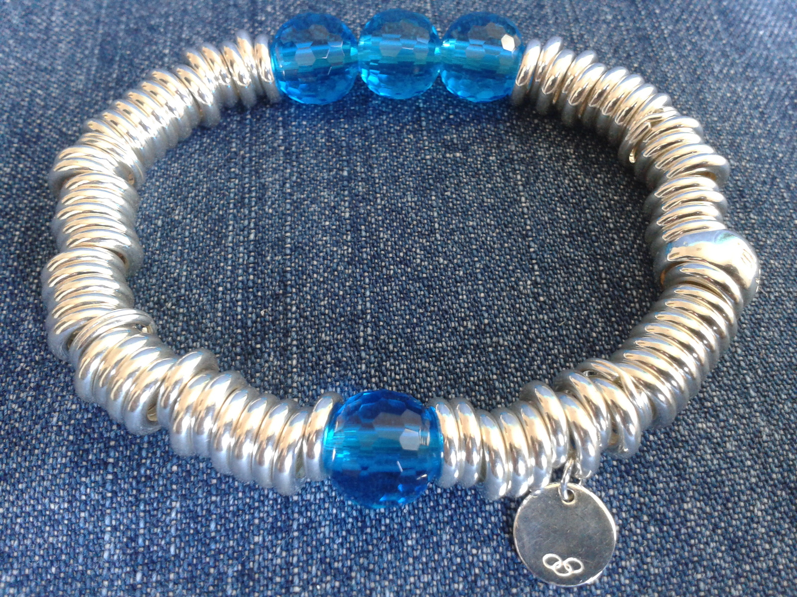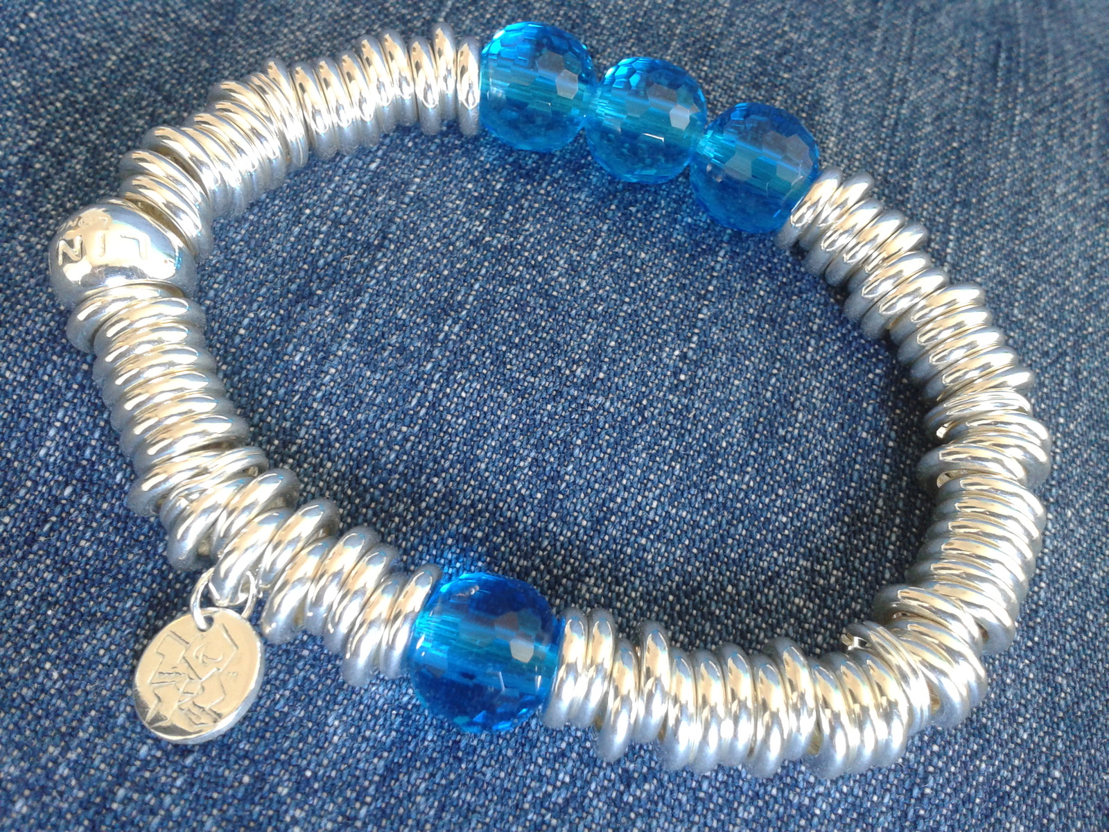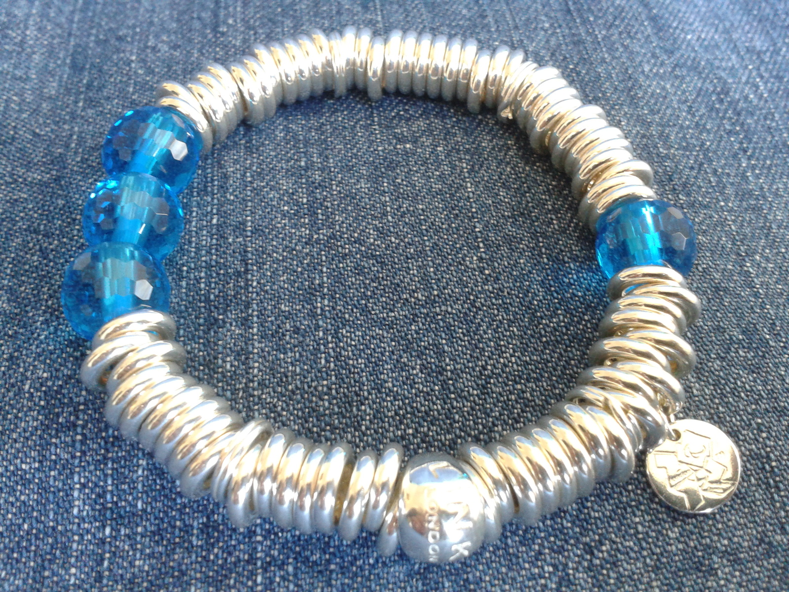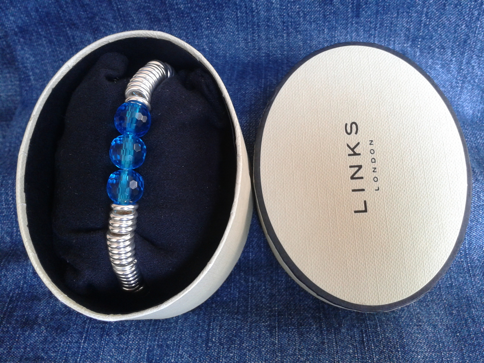 The bracelet carries a thicker ring which is inscribed Links of London. Bright turquoise faceted crystal beads add sparkle and glamour to this lovely accessory.