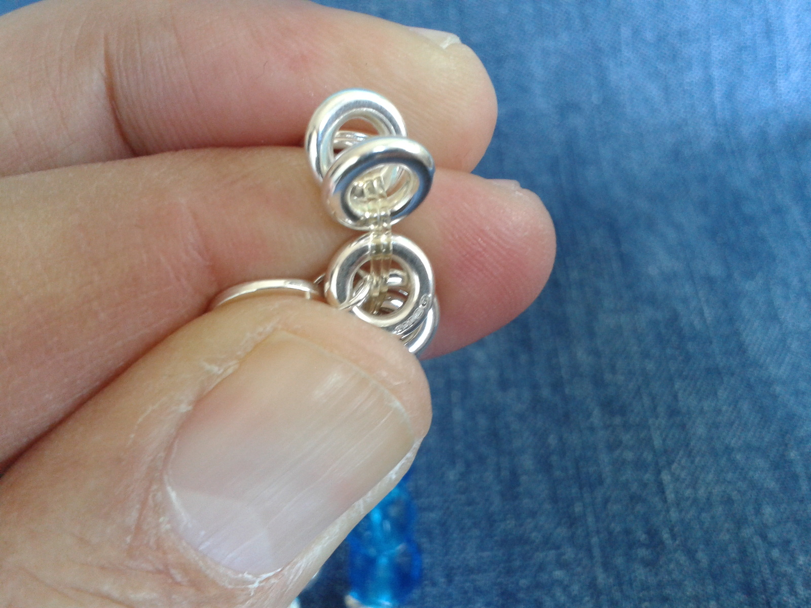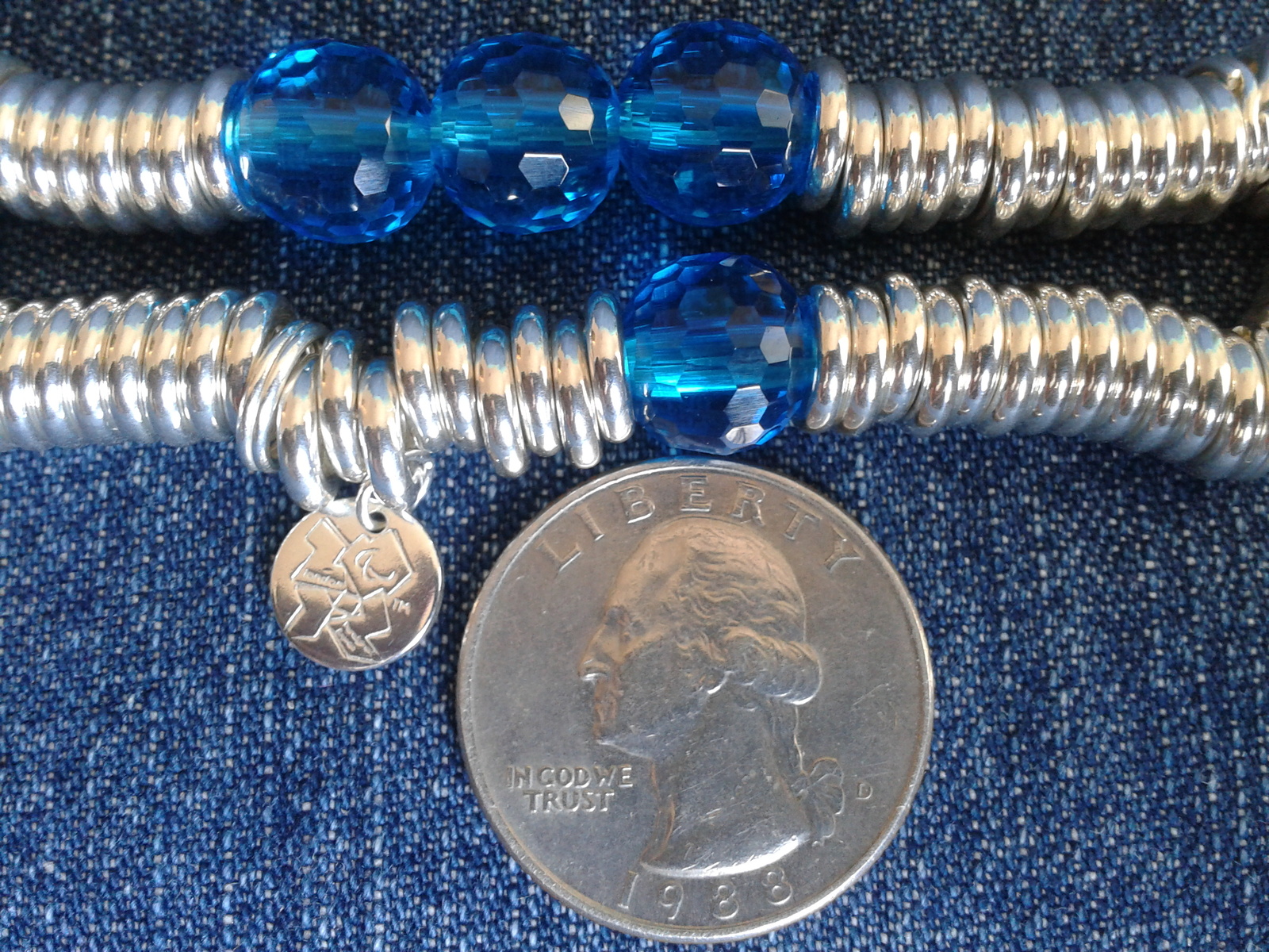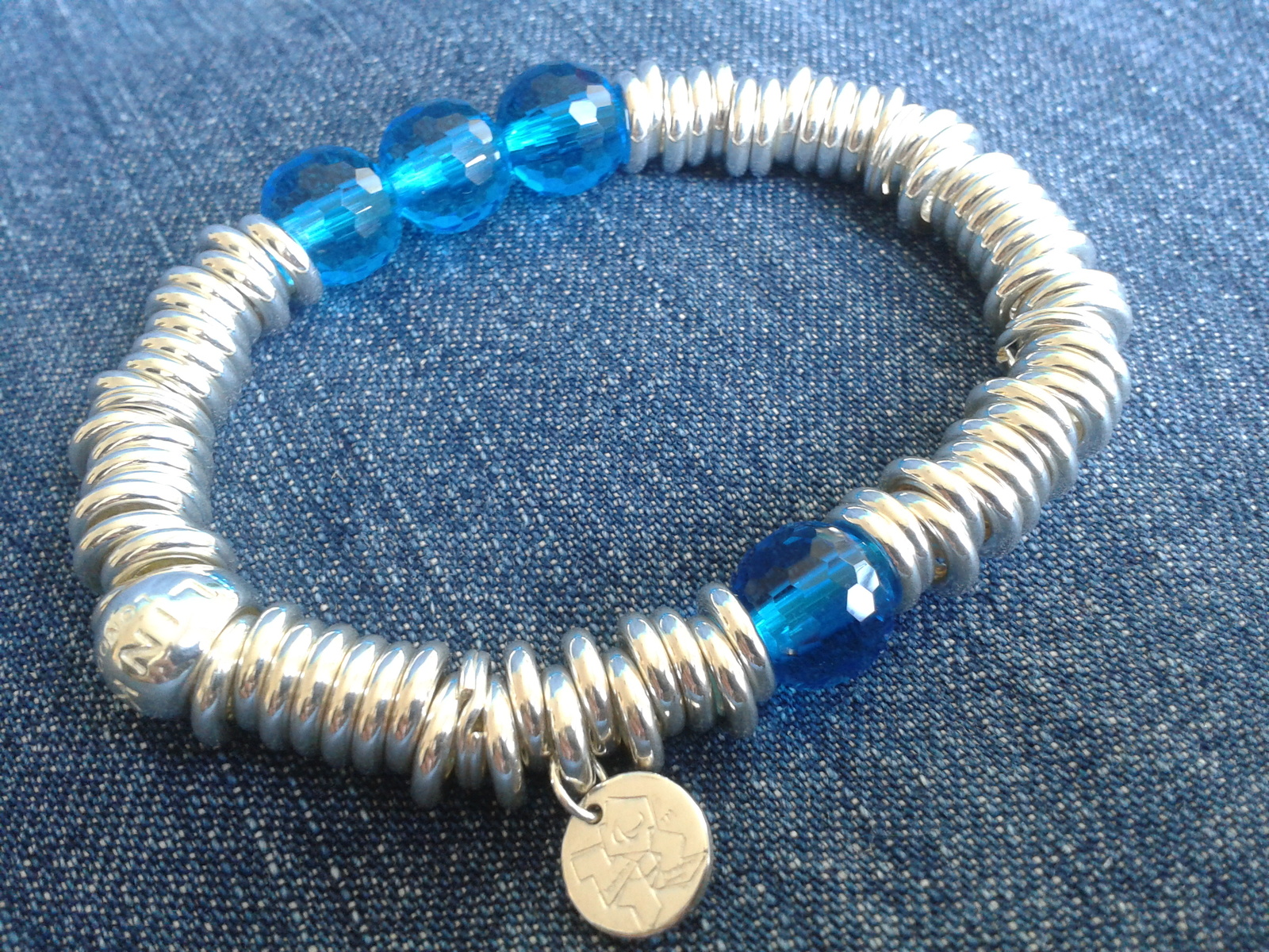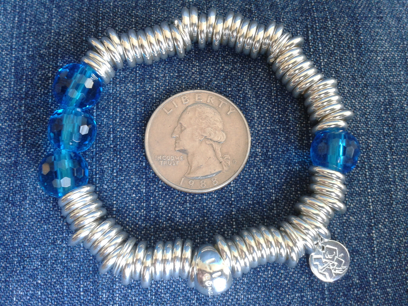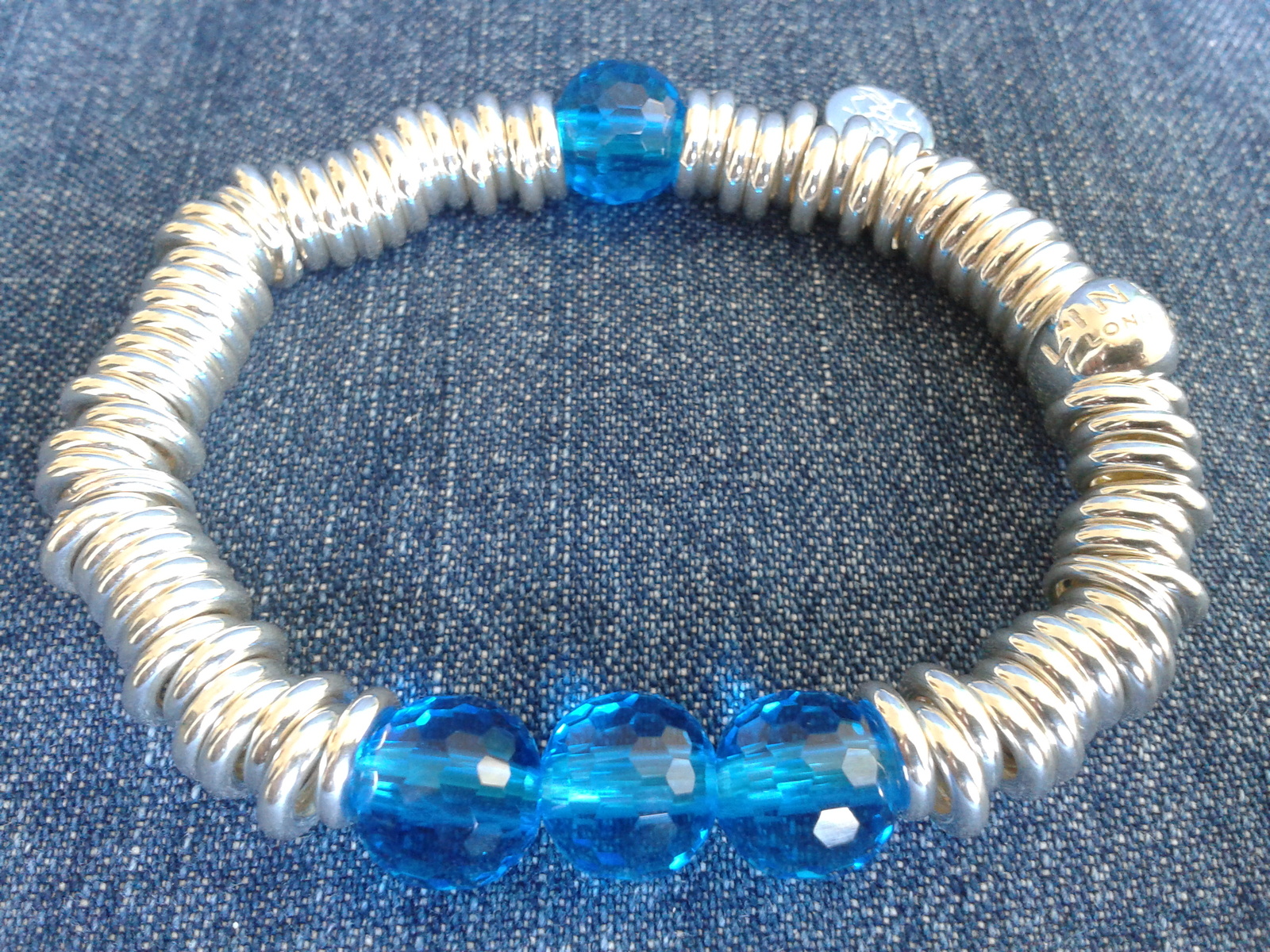 The bracelet carries a thicker ring which is inscribed Links of London. Bright turquoise faceted crystal beads add sparkle and glamour to this lovely accessory.